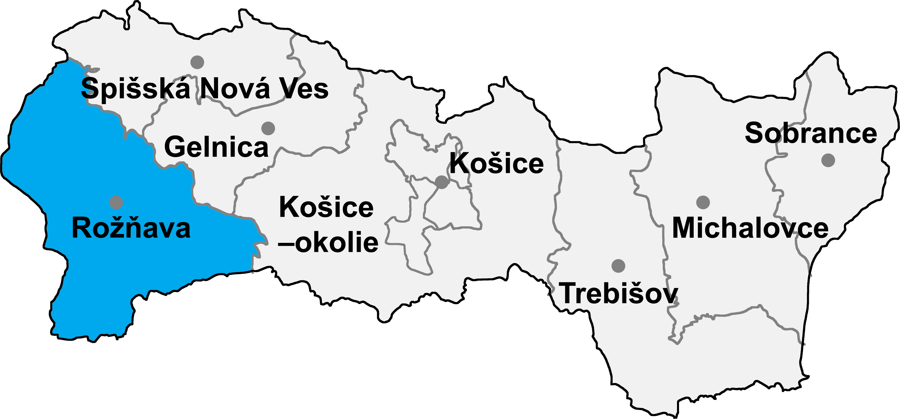 Mapa + English: map of the Košice region (Košický kraj) in Slovakia, district (okres) of Rožňava highlighted