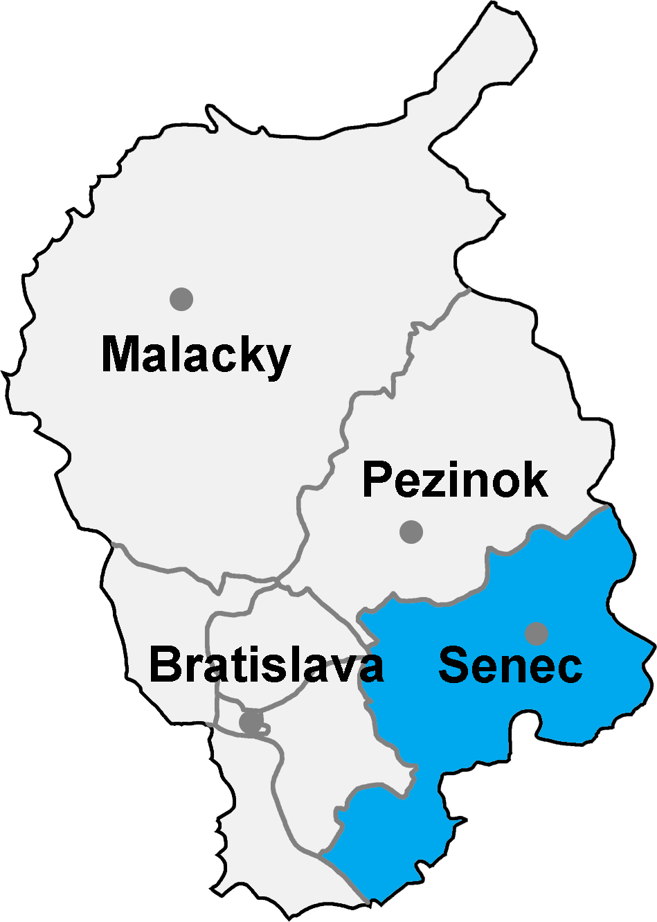 Mapa + English: map of the Bratislava region (Bratislavský kraj) in Slovakia, district (okres) of Senec highlighted