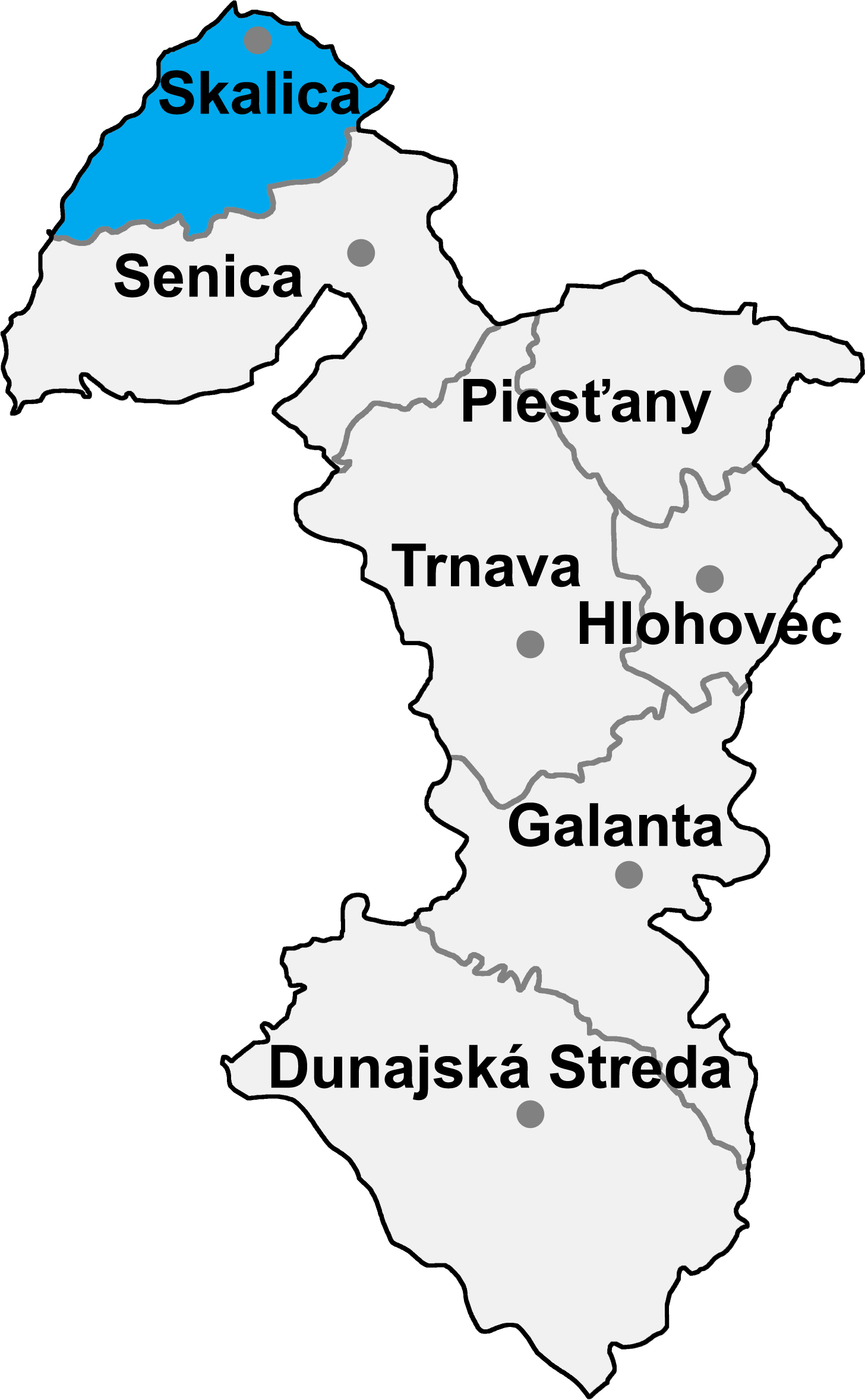 Mapa + English: map of the Trnava region (Trnavský kraj) in Slovakia, district (okres) of Skalica highlighted