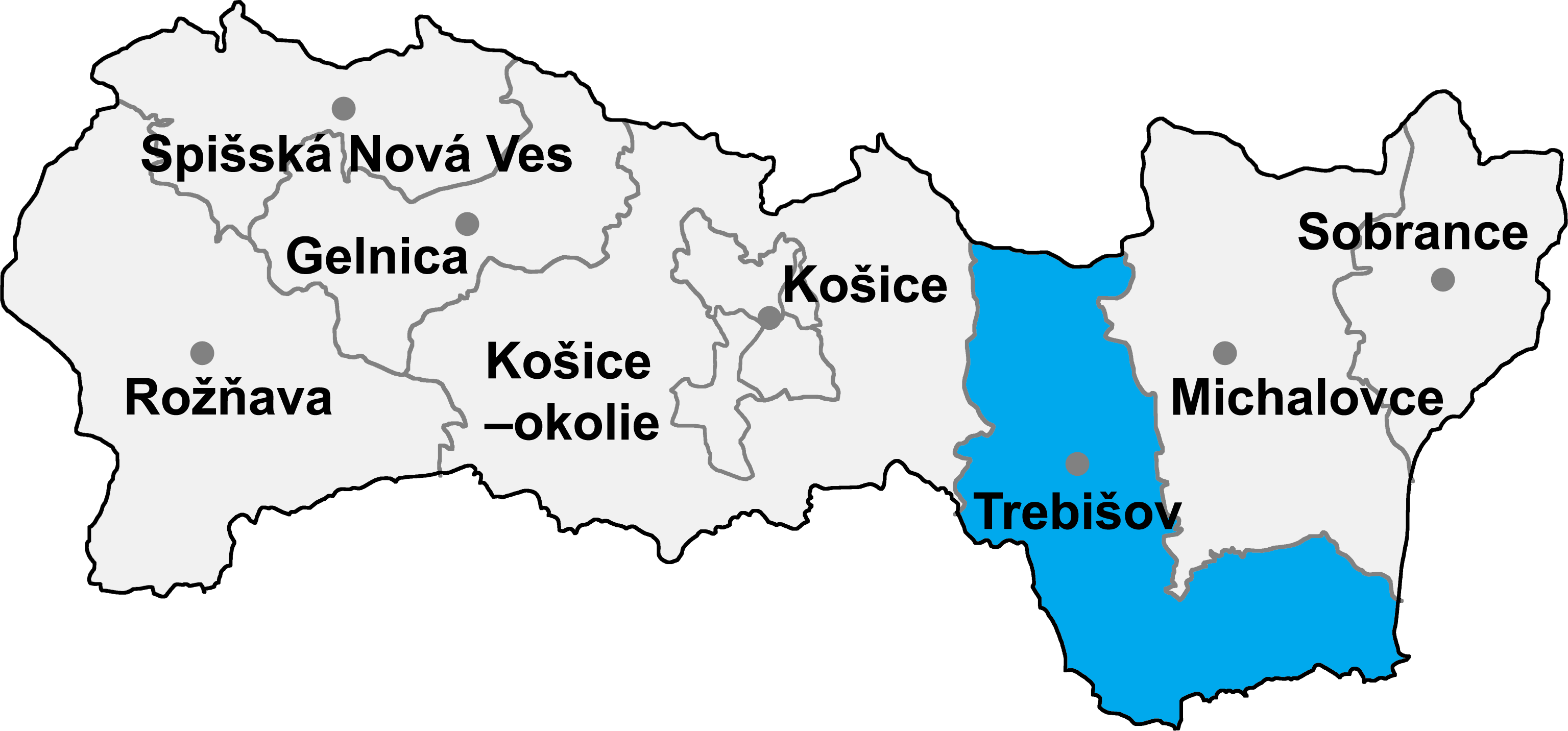 Mapa + English: map of the Košice region (Košický kraj) in Slovakia, district (okres) of Trebišov highlighted