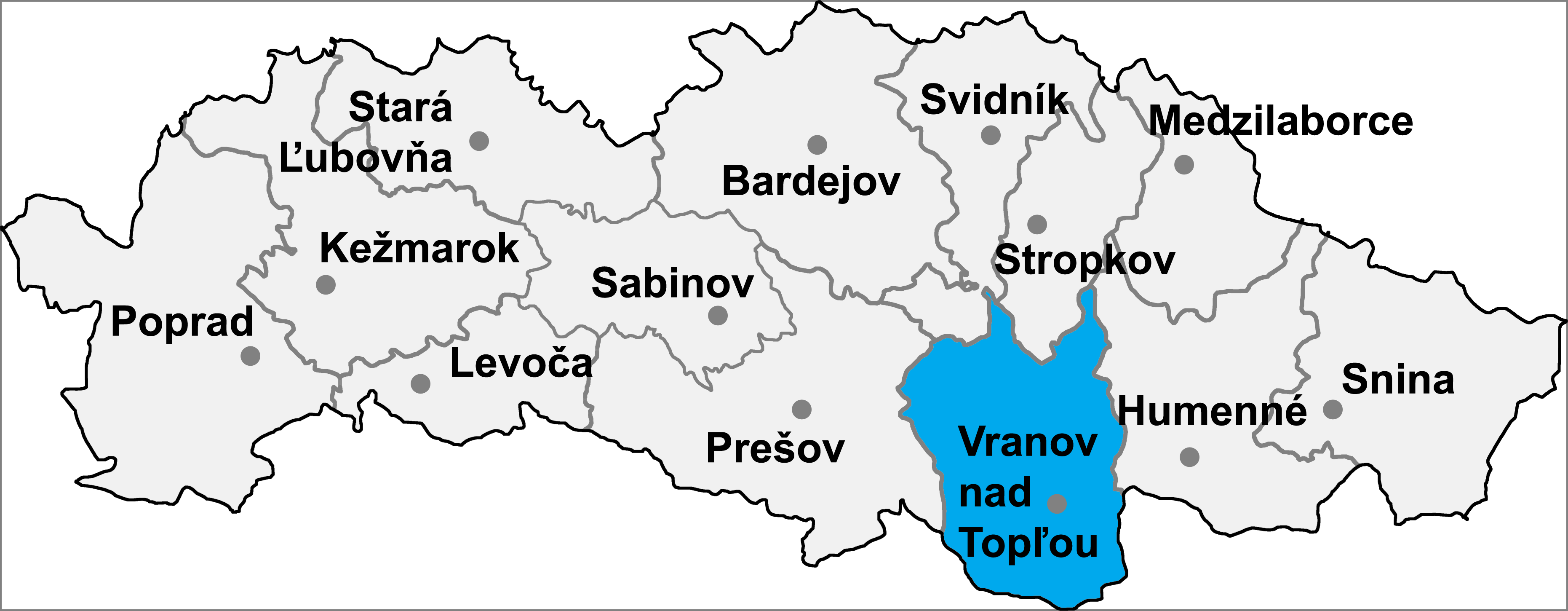 Mapa + English: map of the Banská Prešov region (Prešovský kraj) in Slovakia, district (okres) of Vranov nad Topľou highlighted
