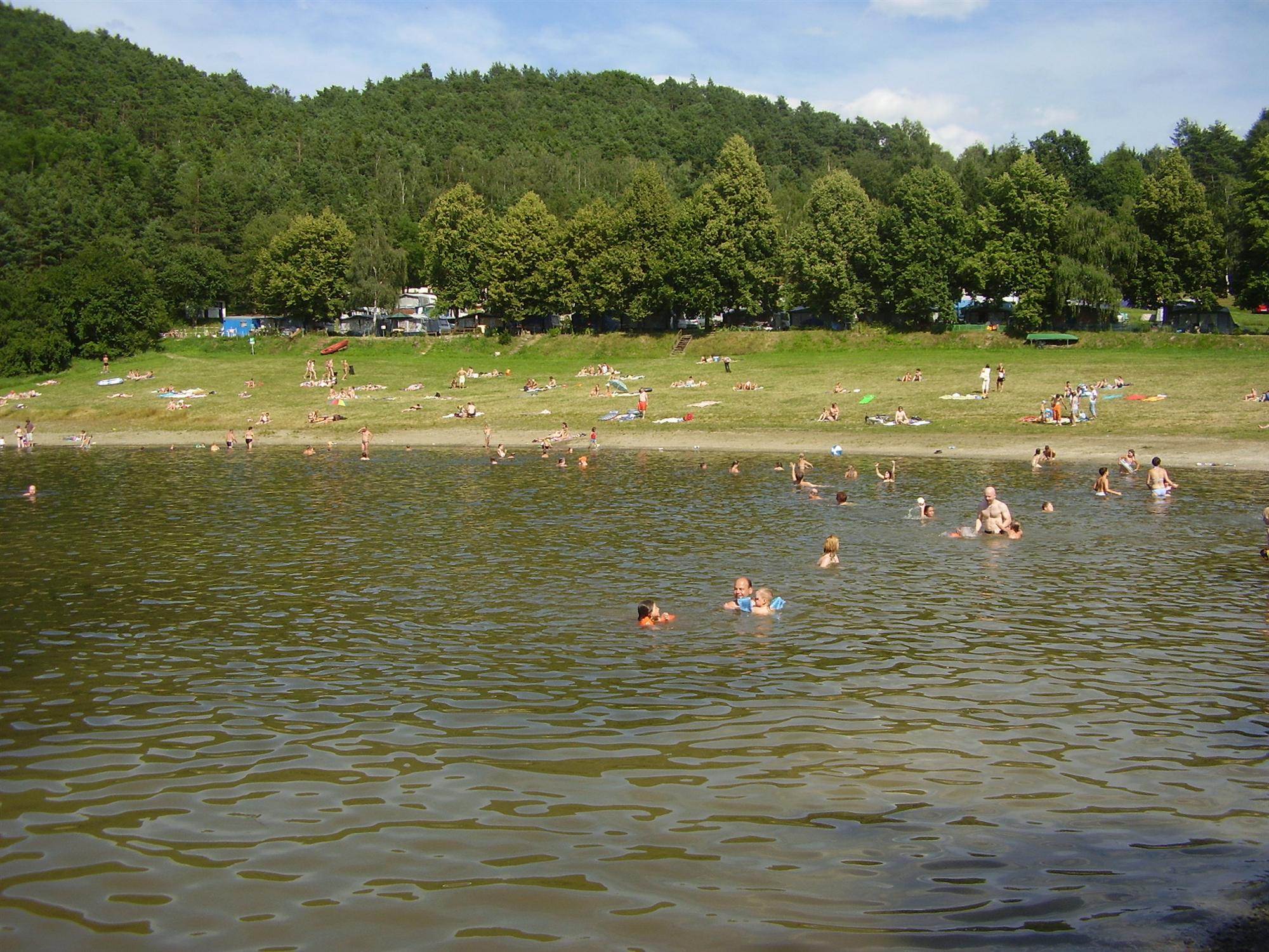 Fotografie + Česky: Pláž u hráze Orlické přehrady, tábořiště Popelíky.