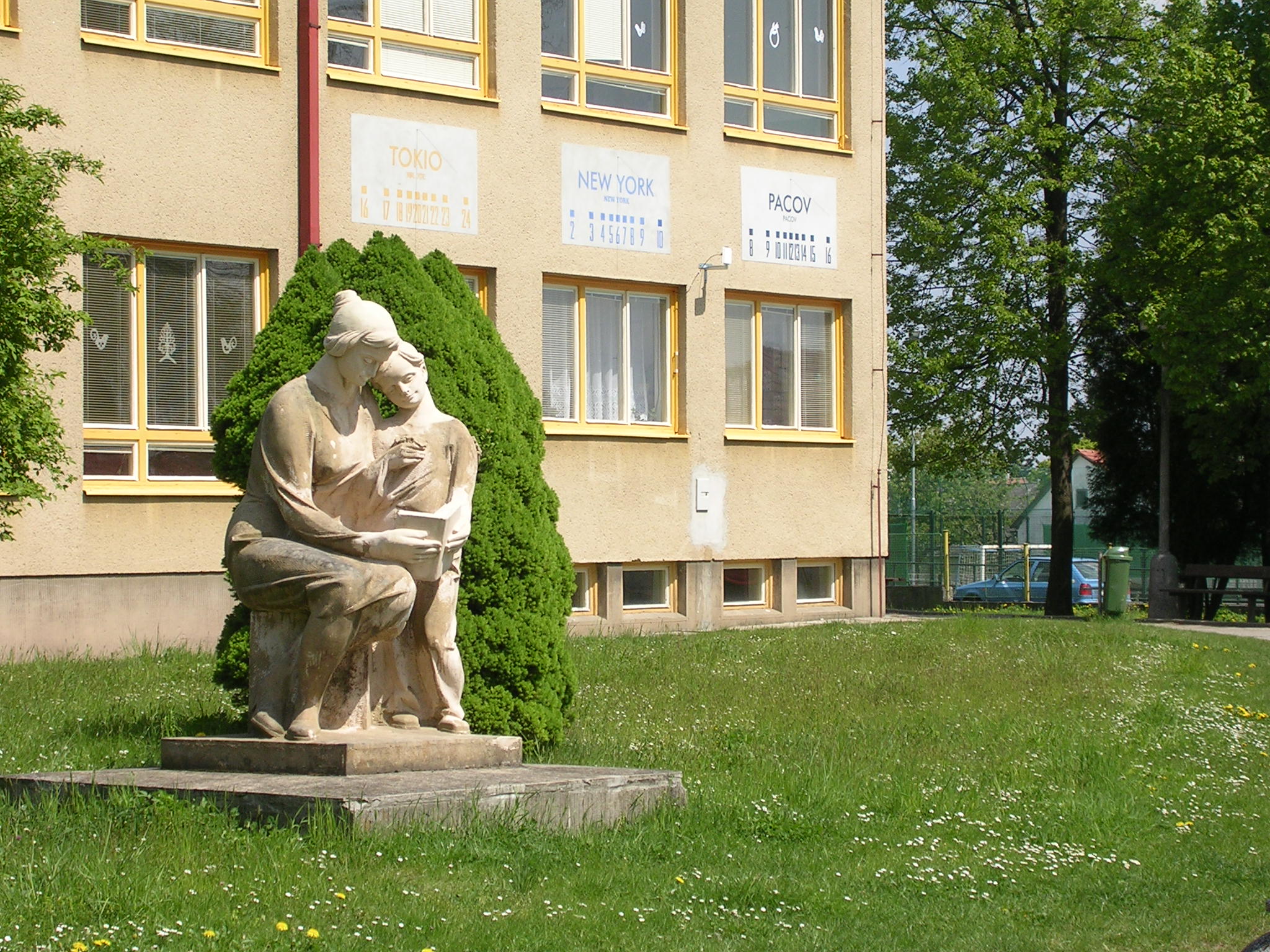 Soubor:Pacov, škola , světové sluneční hodiny a sousoší.jpg