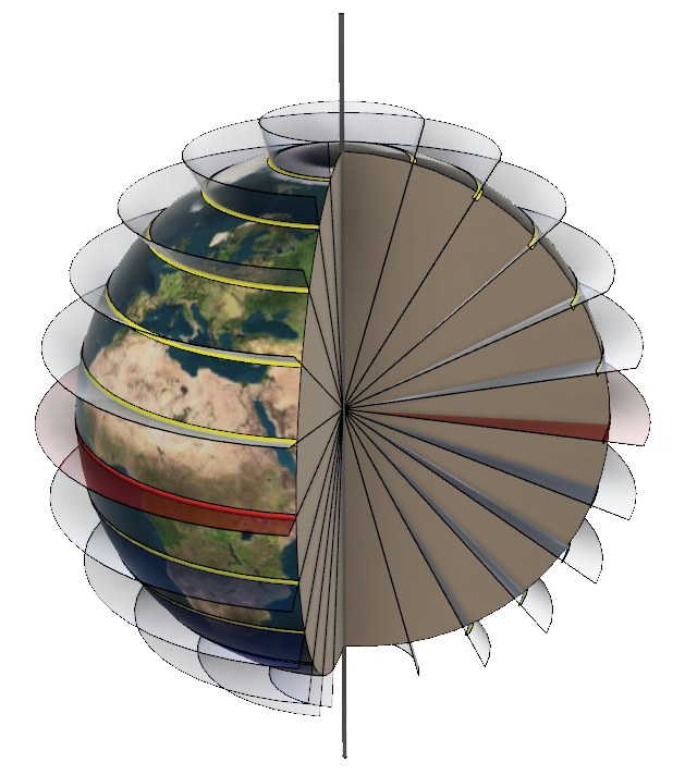- Čeština: Model rovnoběžky, coby čáry na zemském povrchu, vzniklé průnikem povrchu Země a rotačního kuželu, jehož vrchol je v zemském středu a jeho osa je shodná se zemskou osou. Červeně je zvýrazněn rovník.