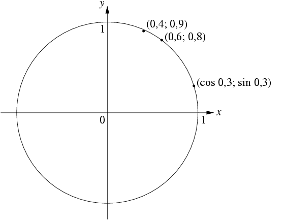 - Čeština: Jednotková kružnice a parametrická rovnice. Body [cos(0,3); sin(0,3)] a [0,6; 0,8] na kružnici leží, zatímco bod [0,4; 0,9] leží uvnitř kružnice.