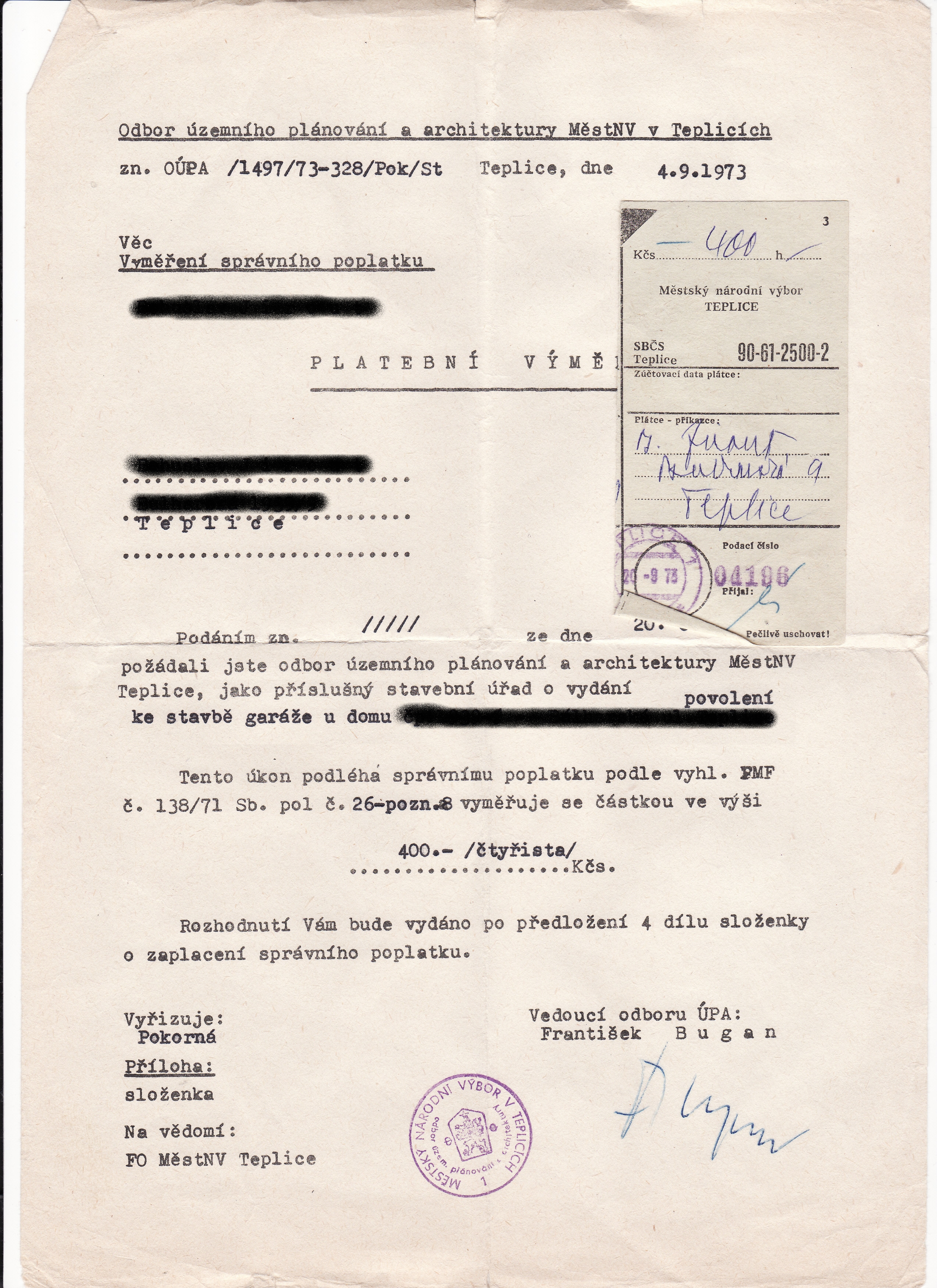 Fotografie + Čeština: Poplatek 400 Kčs za vyřízení povolení ke stavbě garáže z roku 1973.