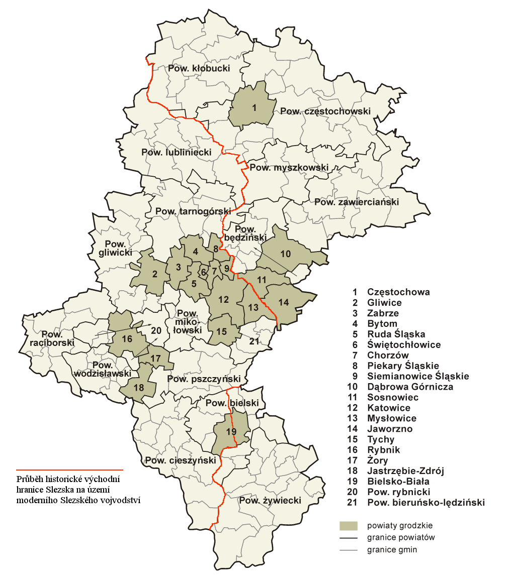 - Čeština: Průběh hranice mezi Republika obou národů a země Koruny české z aktuální mapy moderního Slezského vojvodství, považována za moderní hranici mezi Slezskem a Malopolsko