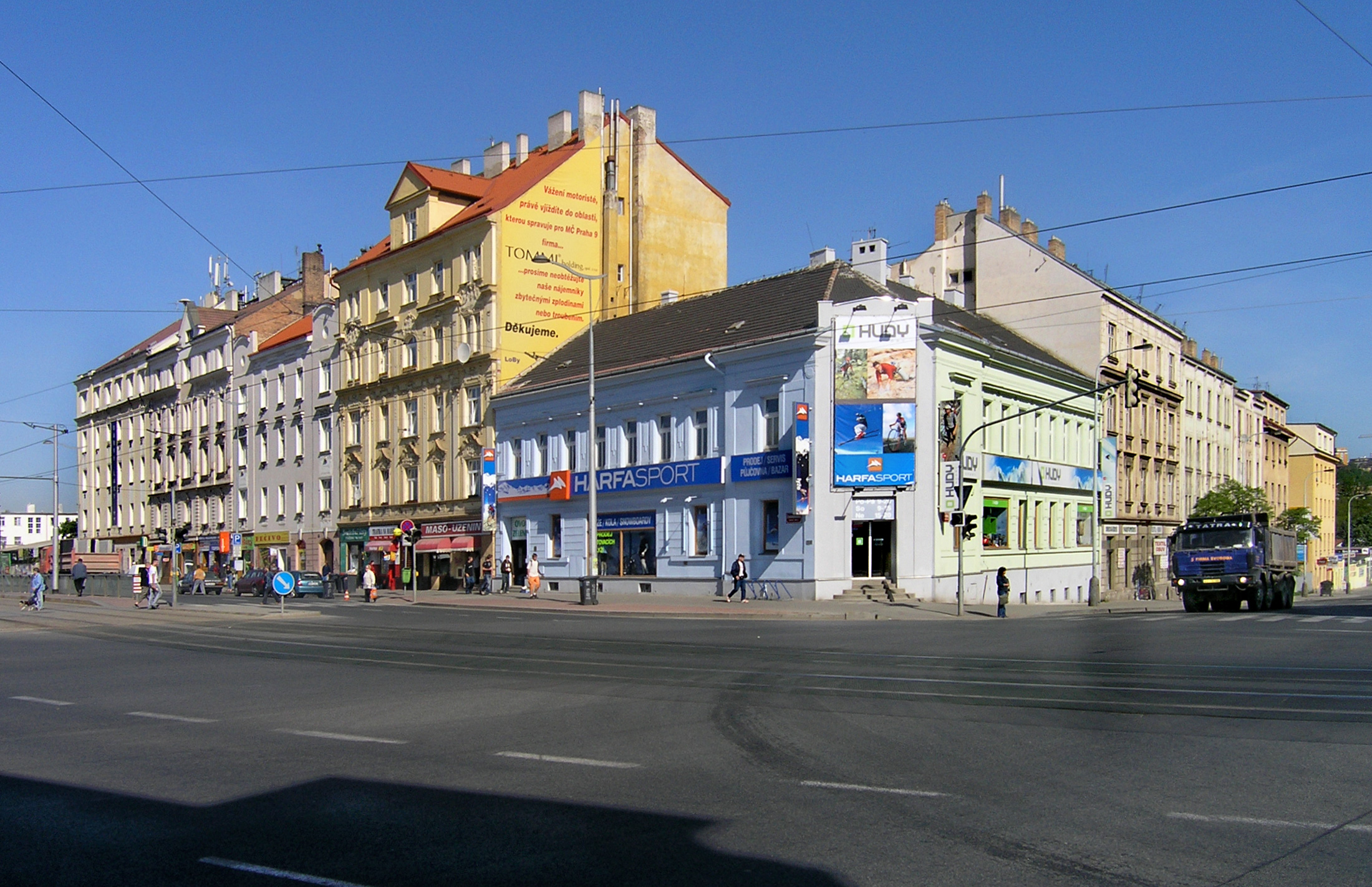 Fotografie + Čeština: Křižovatka Harfa ve Vysočanech (Praha 9). Zleva ulice Českomoravská, zprava Freyova