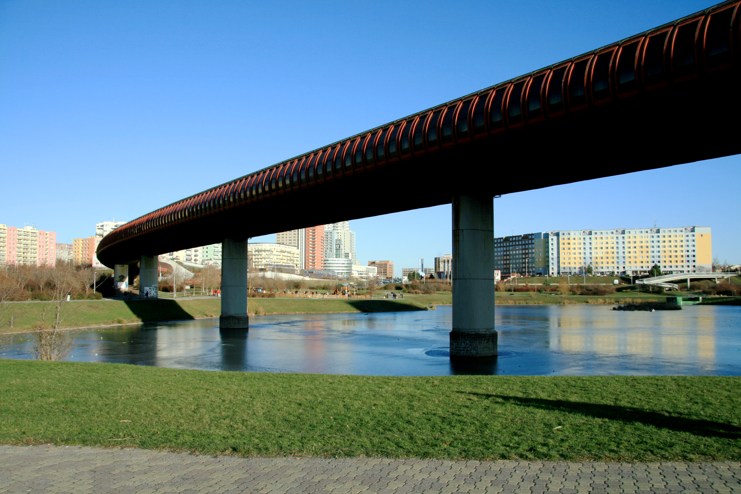 - English: Bridge for Prague Metro line B over 2. reservoir on Prokopský potok in Stodůlky, Prague, Czech Republic