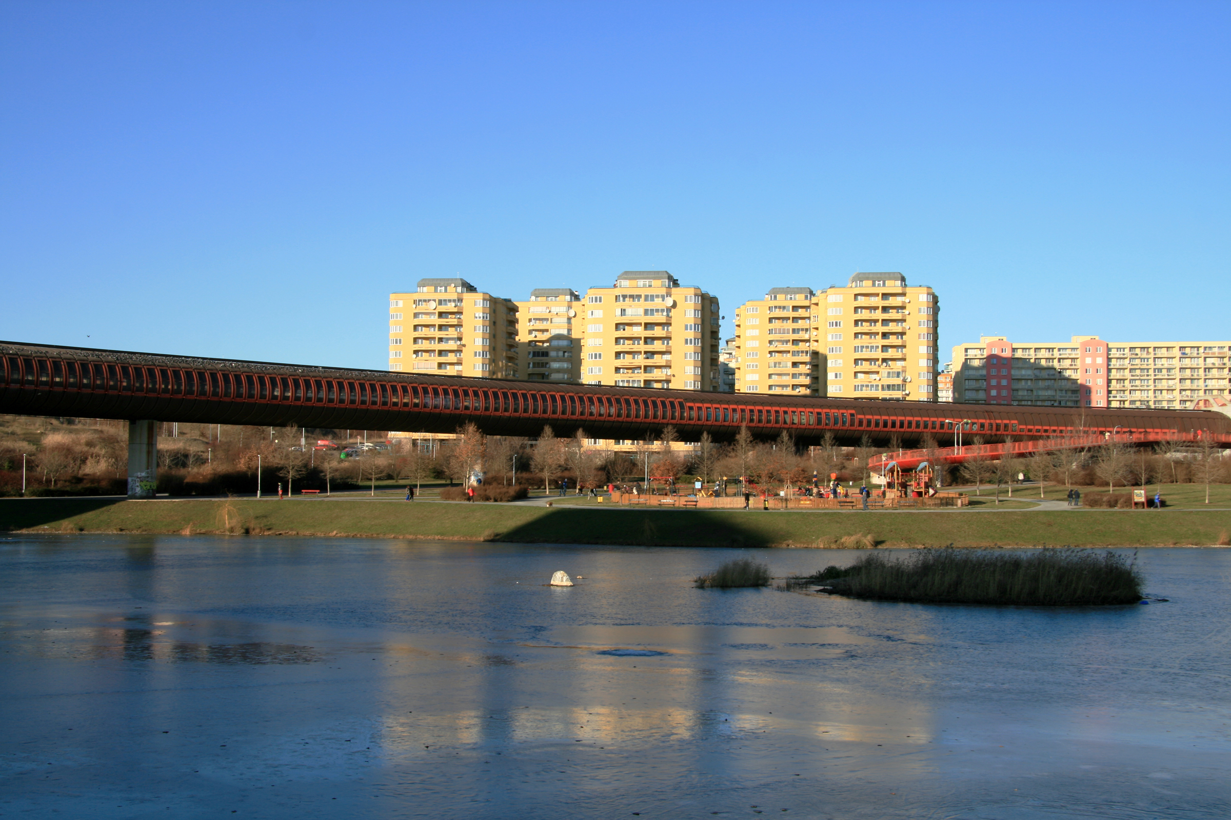 Fotografie + English: Bridge for Prague Metro line B over 2. reservoir on Prokopský potok in Stodůlky, Prague, Czech Republic