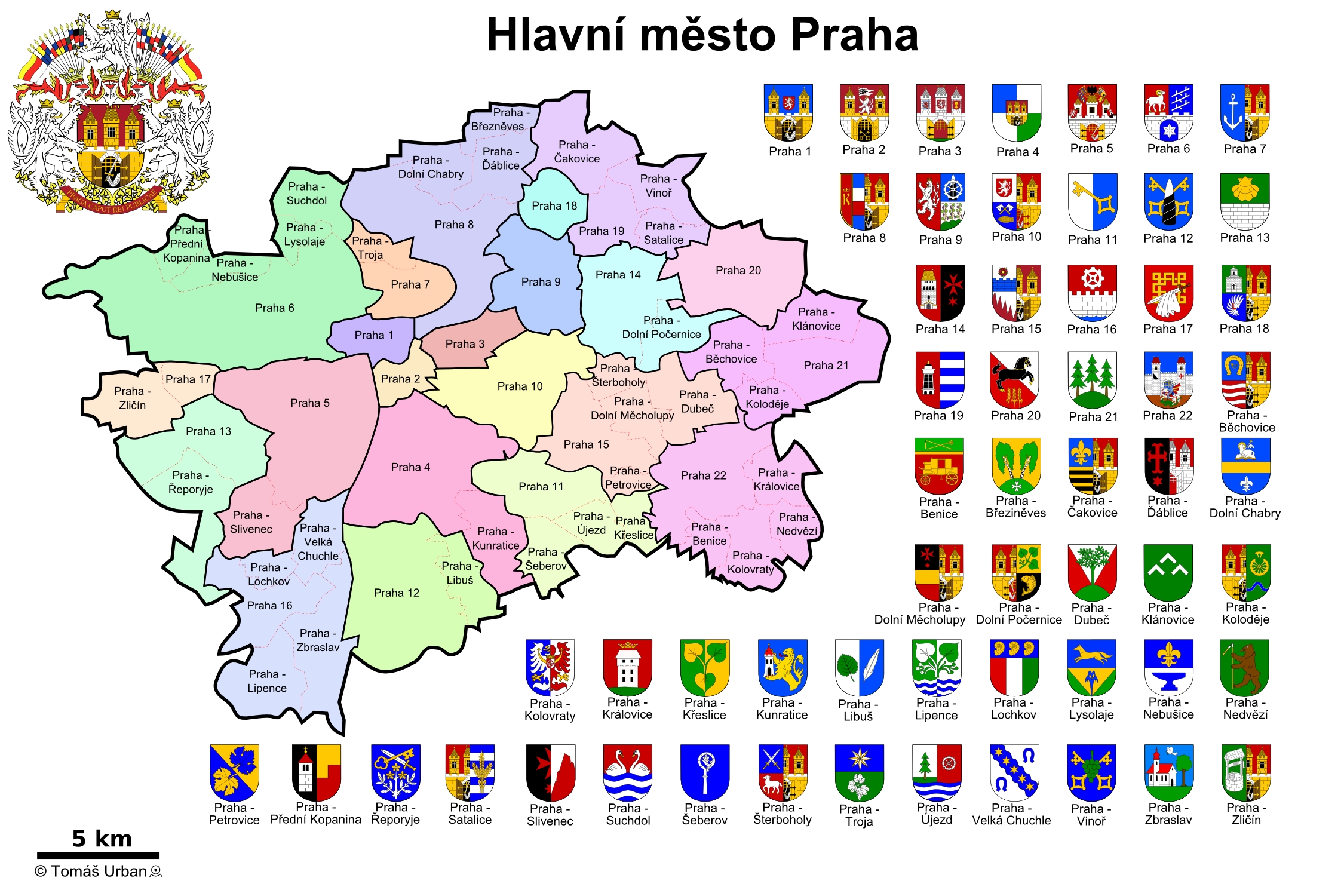 Mapa + Description: Čeština: Mapa Prahy a jejich obvodů a znaky městských částí