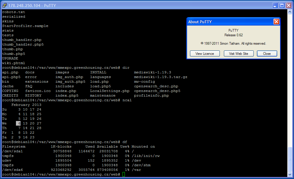 Snímek obrazovky programu + PuTTY verze 0.62 ukazuje prostředí starého serveru Multimediaexpo.cz...(procesor AMD Athlon II X2 250, 2 x 1 TB) u společnosti Greendata/Greenhousing.cz, která od počátku ignorovala většinu mých požadavků v režimu Managed serveru. Proto jsem z této firmy velmi rychle odešel.