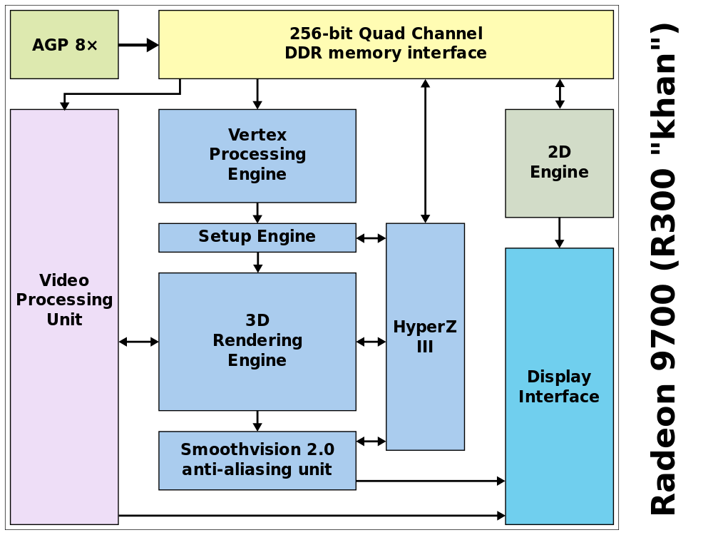 Obrázek + English: Block diagram of the R300 GPU found on the Radeon 9700 graphics card.