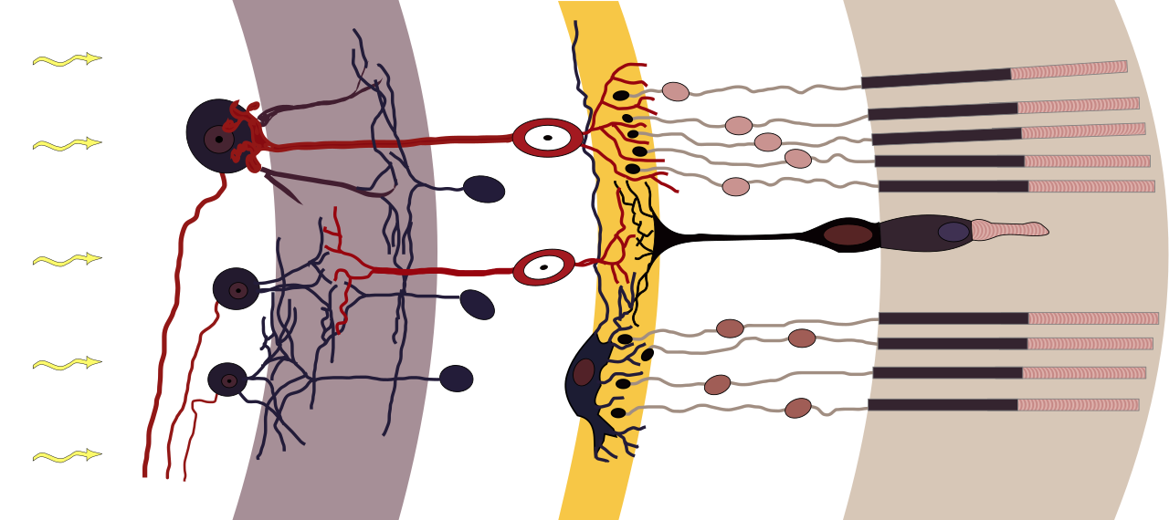 - v. l. n. r.: weiß: Ganglienzellen und ihre Axone, grau: Innere plexiforme Schicht, weiß: Amakrine Zellen, Bipolare, Horizontalzellen, gelb: Äußere plexiforme Schicht, weiß: Fotorezeptoren, hellbraun: Fotorezeptoren Außensegmente