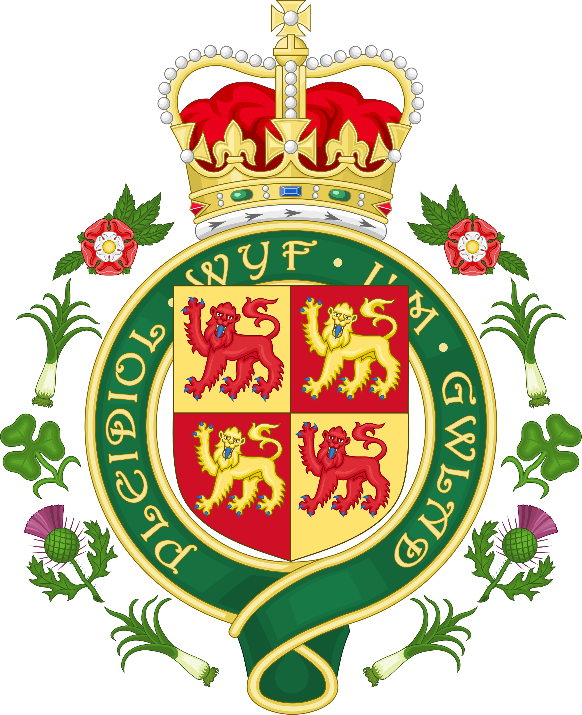 - “Within a circular riband Vert fimbriated Or bearing the motto "Pleidiol Wyf I'm Gwlad" in letters the same and ensigned with a representation of the Crown proper, an escutcheon quarterly Or and Gules four lions passant guardant counterchanged armed and langued Azure, encircled by a wreath alternating of leek, thistle, clover, leek and rose.”