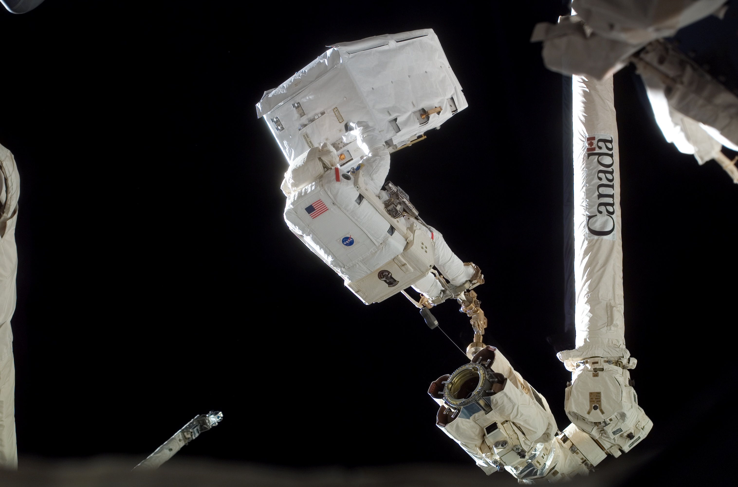 - English: Anchored to a foot restraint on the station's robotic Canadarm2, astronaut Rex Walheim, STS-122 mission specialist, transfers a large nitrogen tank assembly -- used for pressurizing the station's ammonia cooling system -- during the second scheduled session of extravehicular activity (EVA) as construction and maintenance continue on the International Space Station.