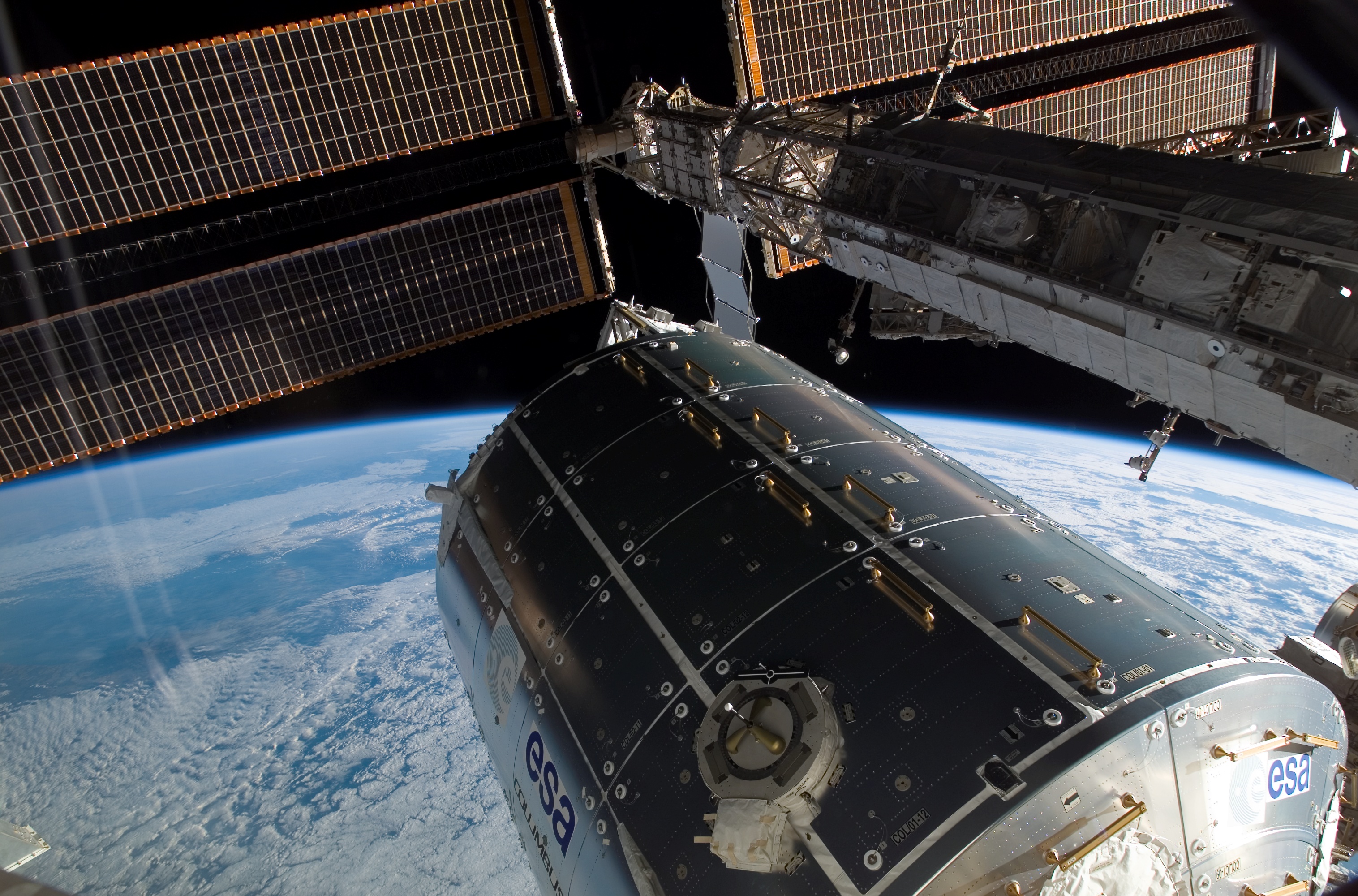 Fotografie + English: Backdropped by the blackness of space and Earth's horizon, the Columbus laboratory (center) -- the newest addition to the International Space Station -- is featured in this image photographed by a crewmember on the Space Shuttle Atlantis while docked with the station.