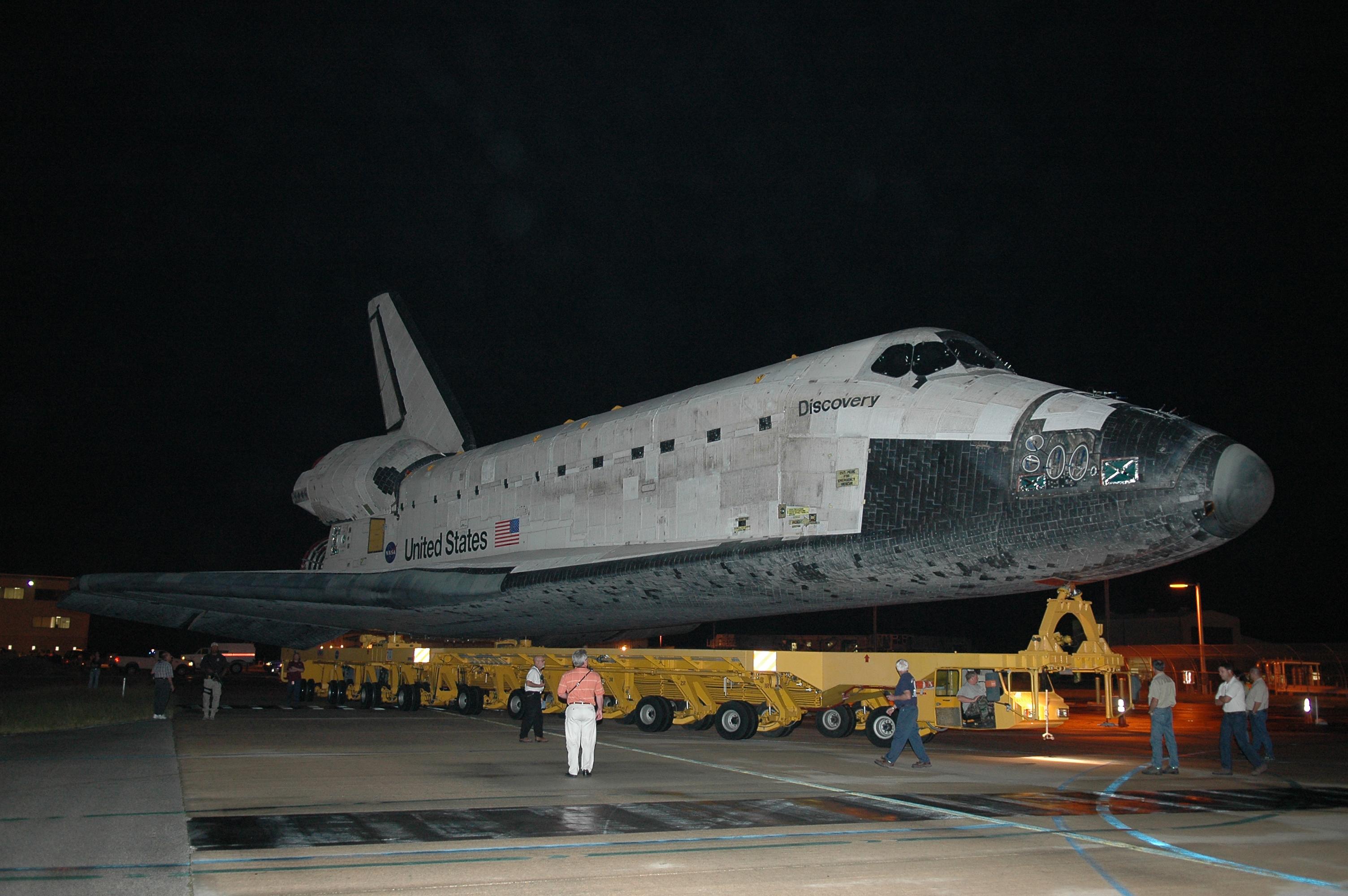 Fotografie + Description: KENNEDY SPACE CENTER, FLA. -- The orbiter Discovery backs out of the Orbiter Processing Facility bay 3 for the short rollover to the Vehicle Assembly Building. First motion was at 9:23 p.m. Oct. 31. In the VAB the orbiter will be mated to its large external tank and twin solid rocket boosters already stacked on the mobile launcher platform. Space Shuttle Discovery is scheduled to roll out to Launch Pad 39B no earlier than Nov. 7 for mission STS-116. The mission is No. 20 to the International Space Station and construction flight 12A.1. The mission payload is the SPACEHAB module, the P5 integrated truss structure and other key components. The launch window for mission STS-116 opens Dec. 7.