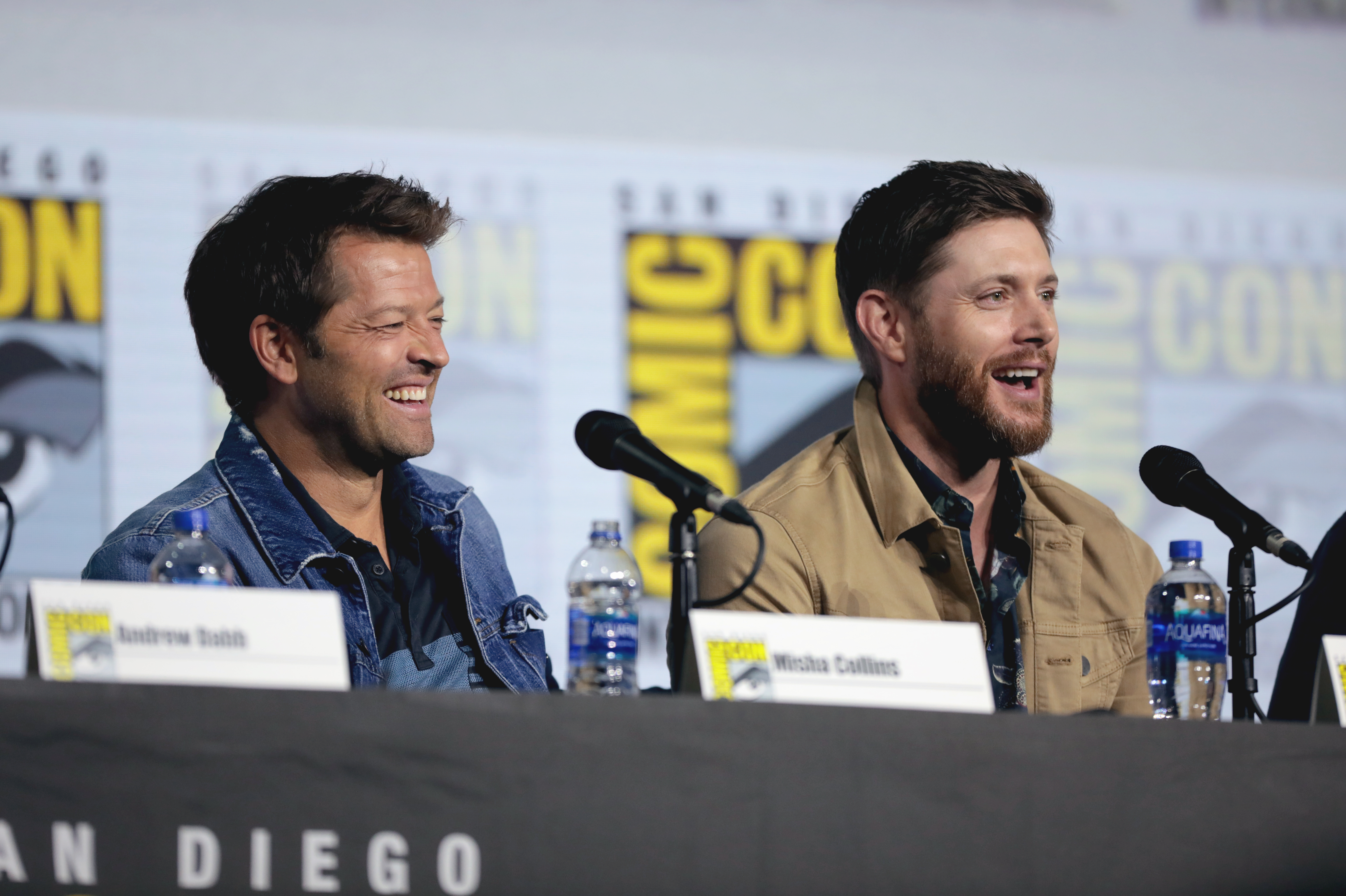 • Misha Collins and Jensen Ackles speaking at the 2019 San Diego Comic Con International, for "Supernatural", at the San Diego Convention Center in San Diego, California.