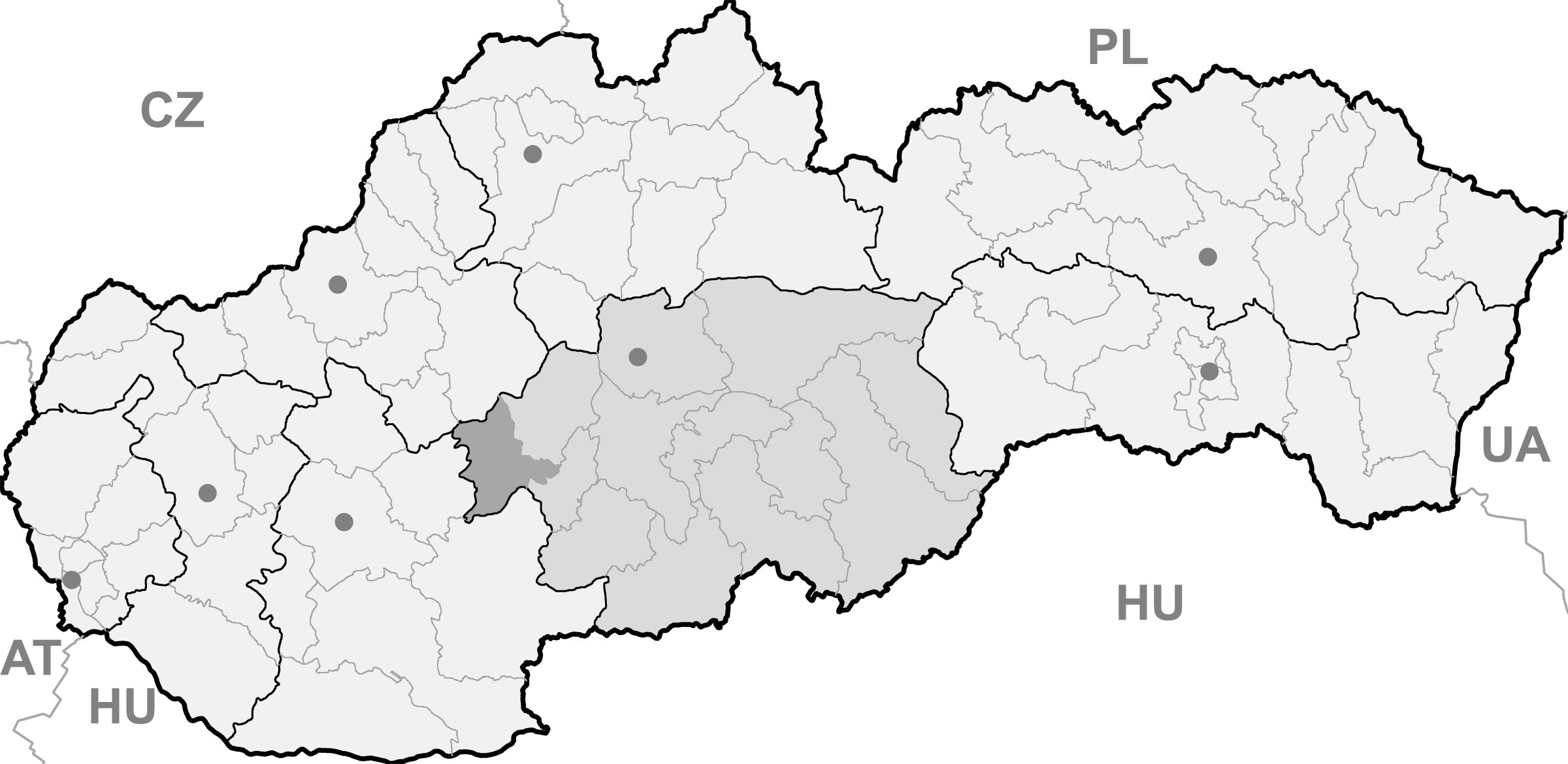 Mapa + English: Map of Slovakia, Zarnovica district and Banská Bystrica region highlighted