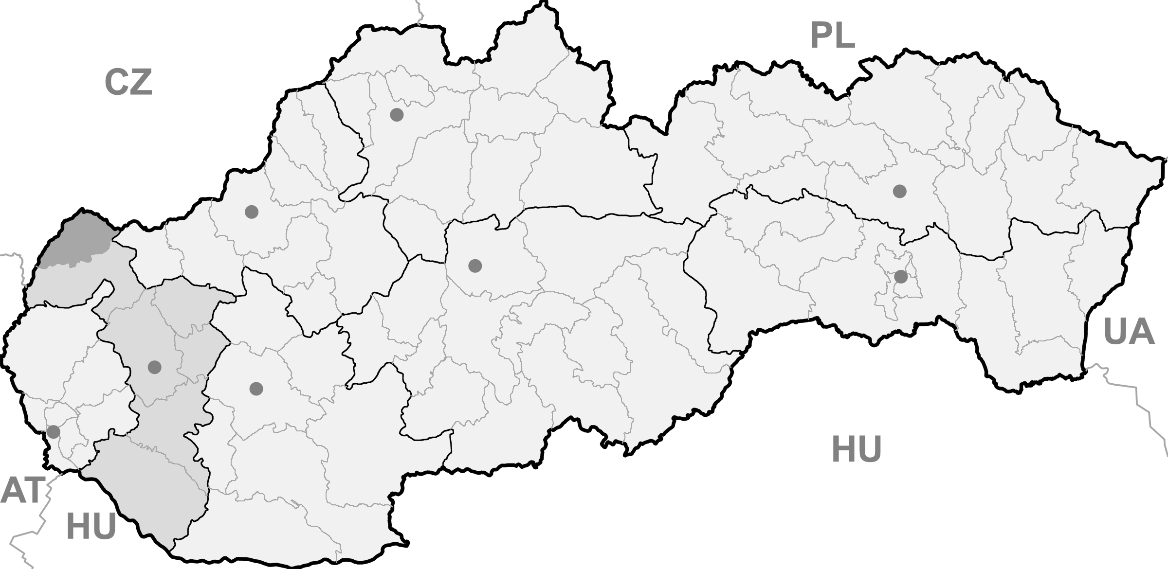 Mapa + English: Map of Slovakia, Skalica district and Trnava region highlighted