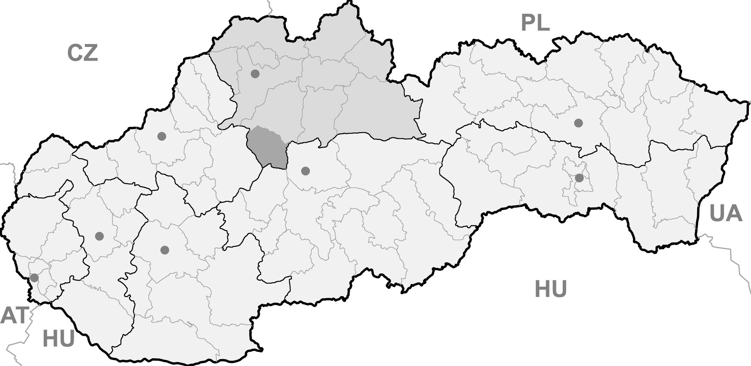 Mapa + English: Map of Slovakia, Turčianske Teplice District in Zilina region highlighted.
