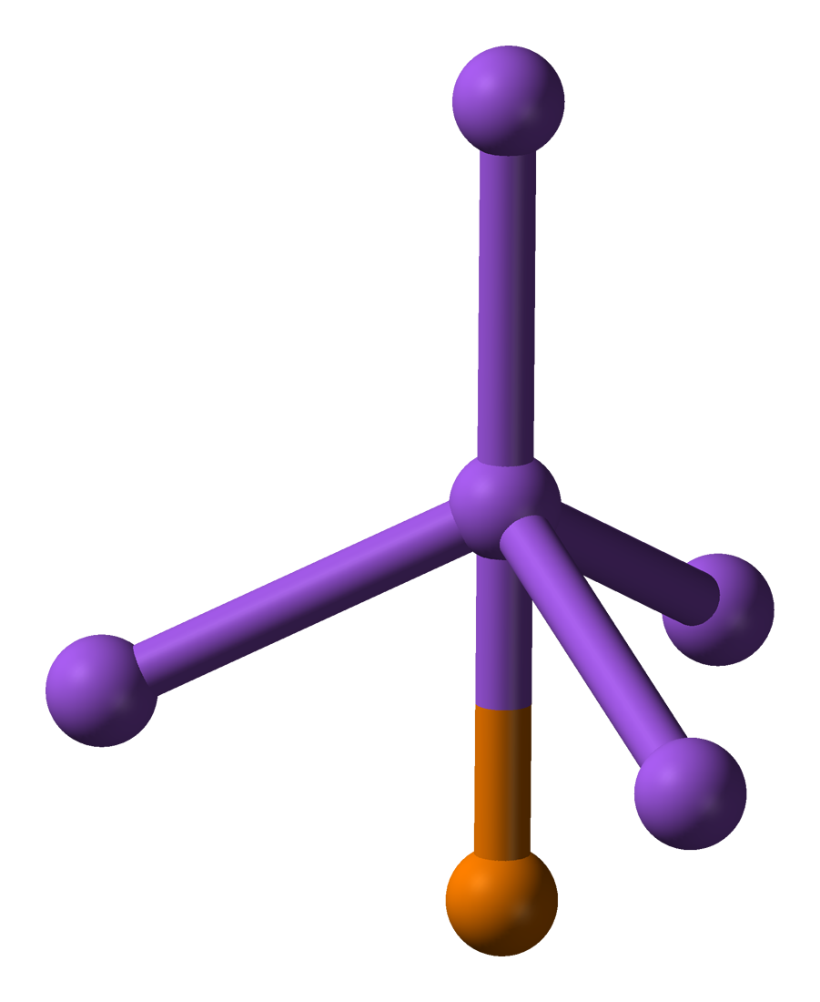 Obrázek + Description: Ball-and-stick model of the coordination of a sodium cation, Na+, by four other sodium cations and a phosphide anion, P3−, in the crystal structure of sodium phosphide, Na3P.
