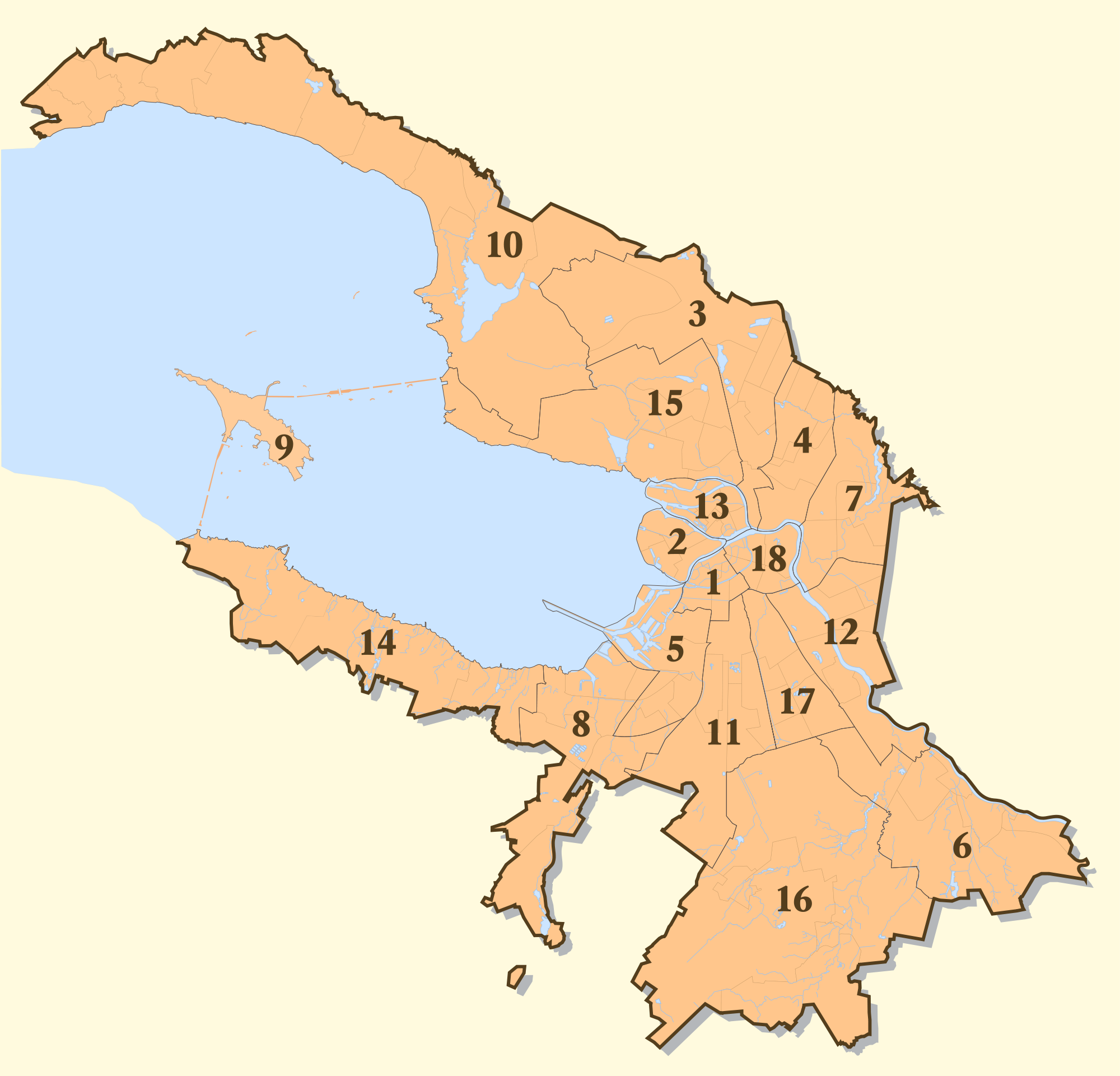 Mapa + Description: English: Saint Petersburg districts map (from 2005), Russian ABC numbering