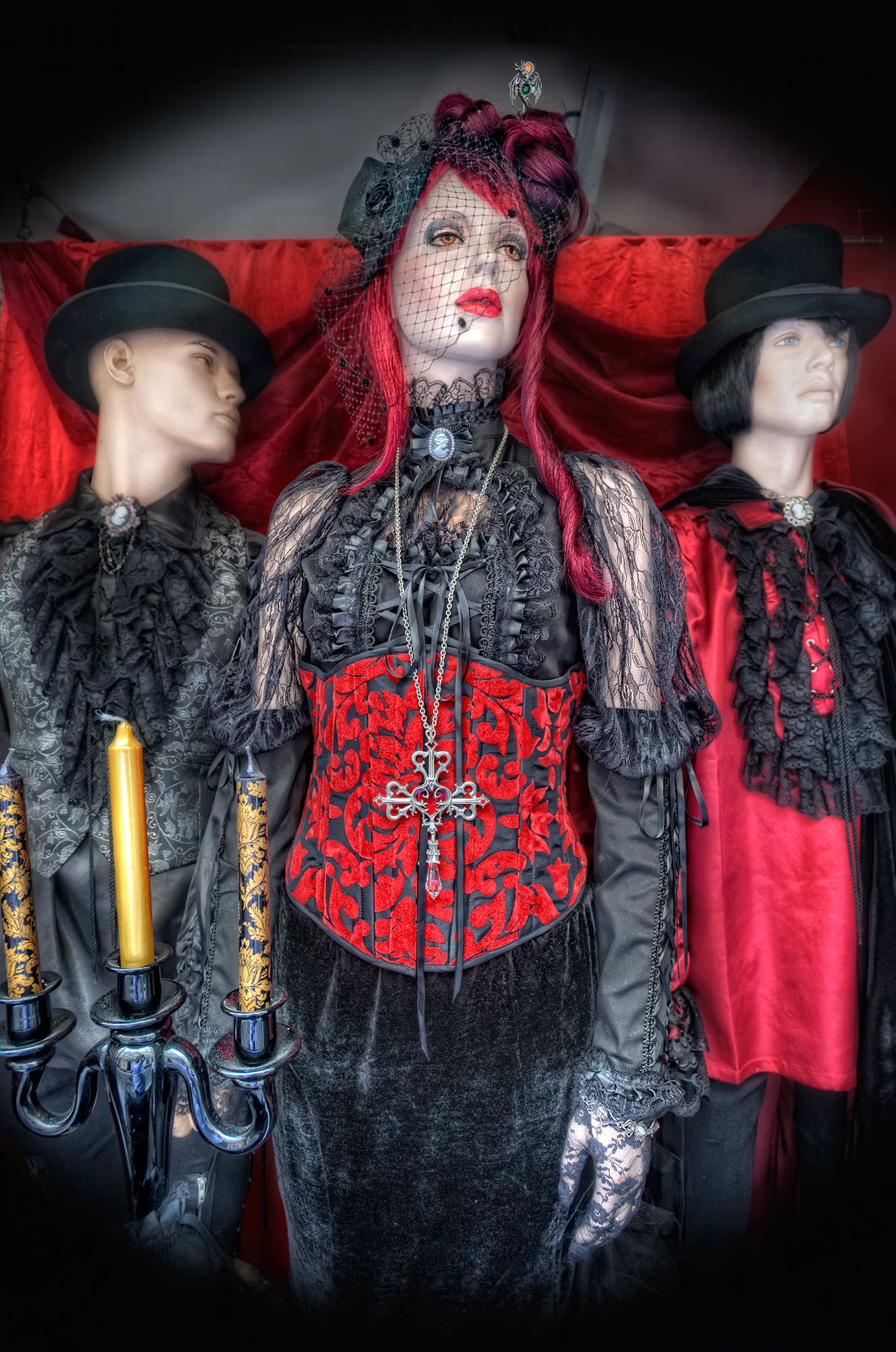 The goth subculture has associated tastes in music, aesthetics, and fashion. Gothic music encompasses a number of different styles including Gothic rock, Darkwave, Ethereal, Neo-Medieval and Neoclassical. Styles of dress within the subculture range from deathrock, punk, androgynous, Victorian, some Renaissance and Medieval style attire, or combinations of the above, most often with dark attire, makeup and hair. HDR from five bracketed exposures (1EV steps), handheld.