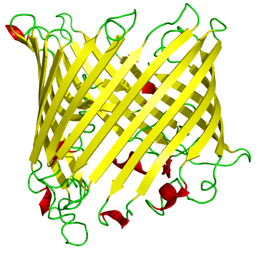 - Side view of a single monomer of a sucrose porin protein from the bacterium Salmonella typhimurium, illustrating the canonical antiparallel beta barrel structure. Porins are transmembrane proteins that facilitate transfer of small molecules such as sucrose that are polar or charged and therefore cannot diffuse through the hydrophobic cell membrane.