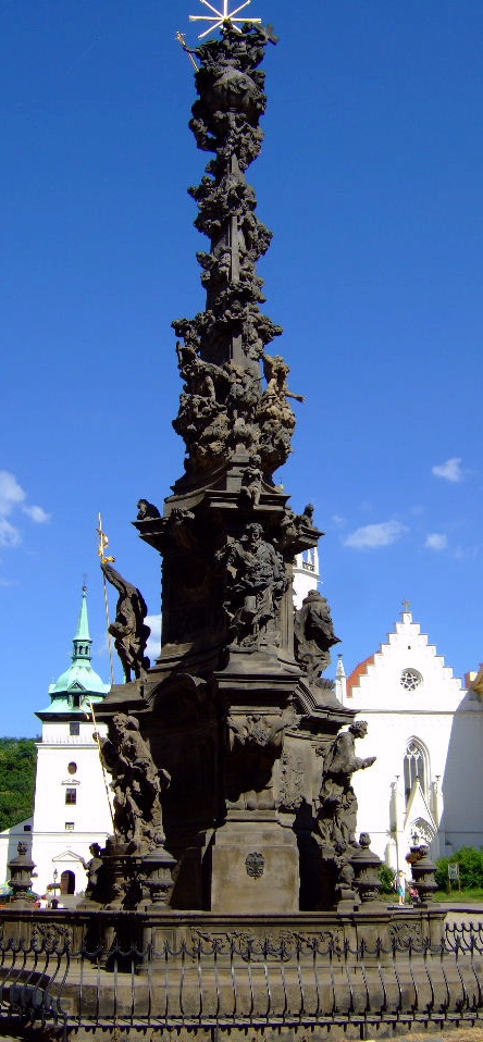 Fotografie + Čeština: Sloup Nejsvětější Trojice v Teplicích, dílo Matyáše Bernarda Brauna z let 1718 až 1719. V pozadí vlevo děkanský kostel sv. Jana Křtitele, vpravo zámecký kostel Povýšení sv. Kříže.