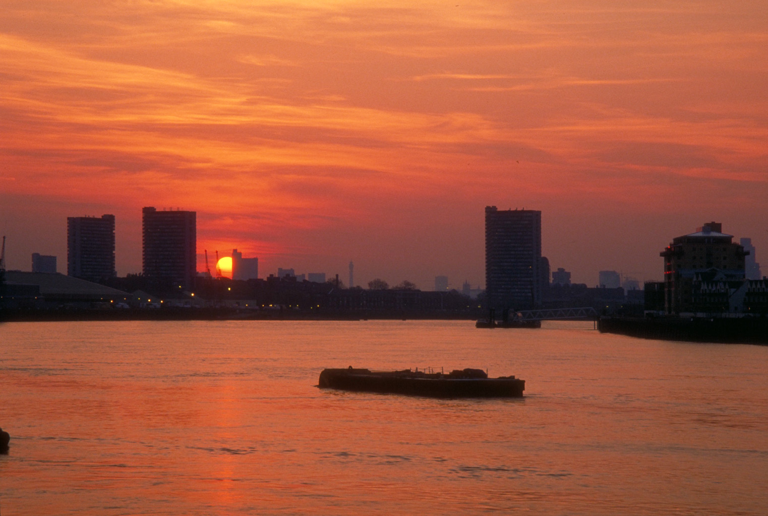 - English: Sunset on the river Thames viewed from Greenwich. Picture shot on Fuji Velvia film using a Minolta SLR by Dlloyd.