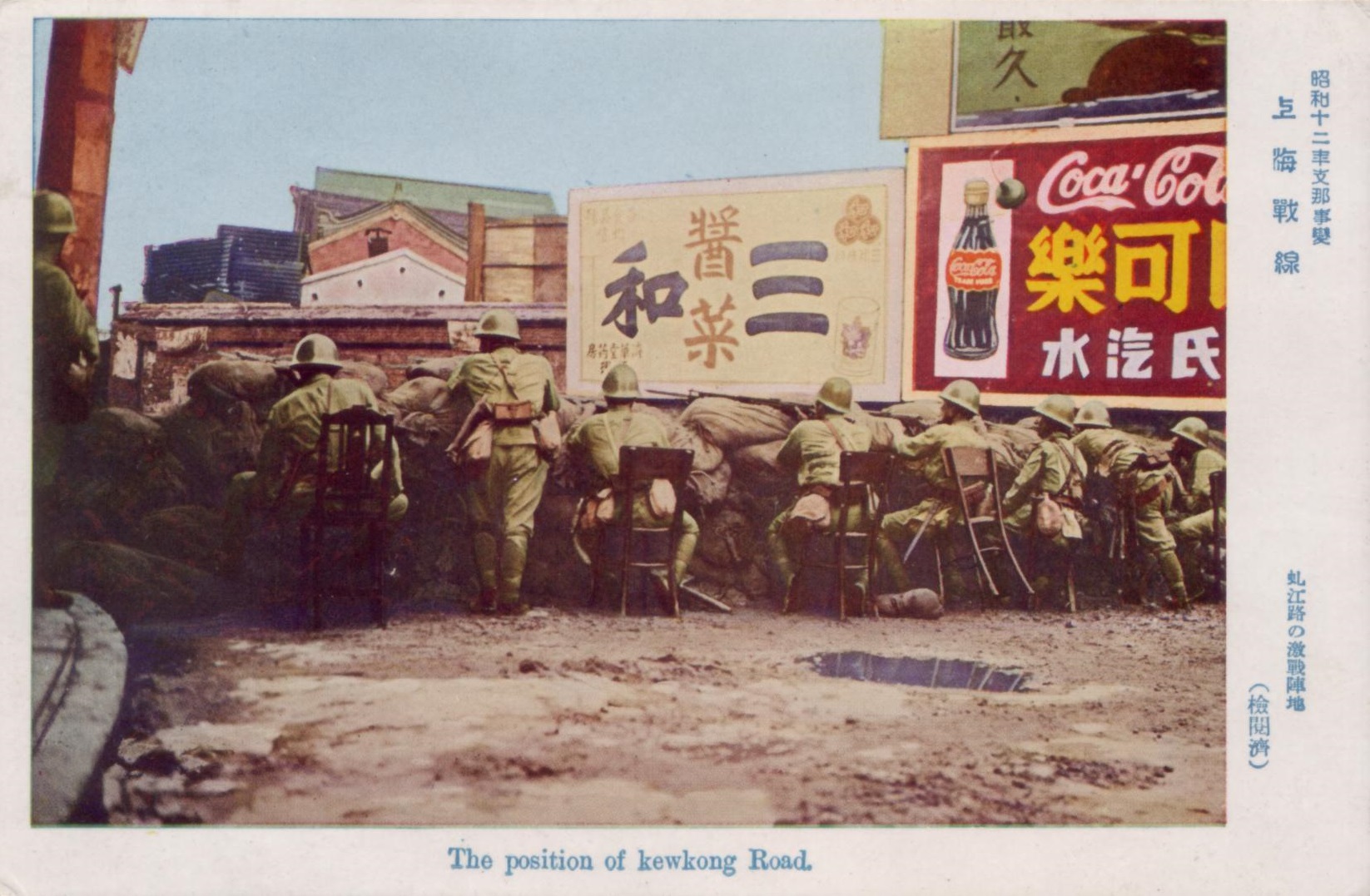 - English: Japanese postcard of the position on Kewkong (Qiujiang) Road during the Battle of Shanghai in 1937