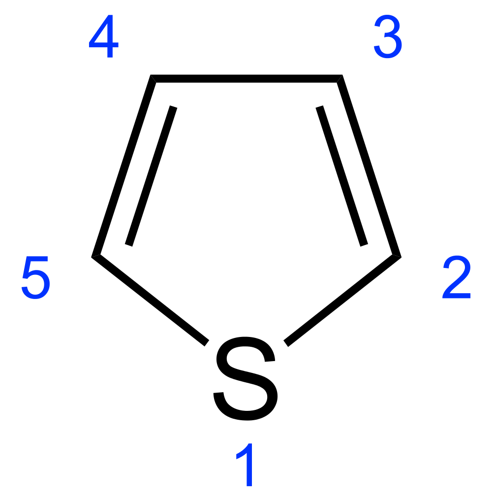 Vzorec + Description: Skeletal formula of the thiophene molecule, a five-membered aromatic heterocycle with four carbons to one sulfur.