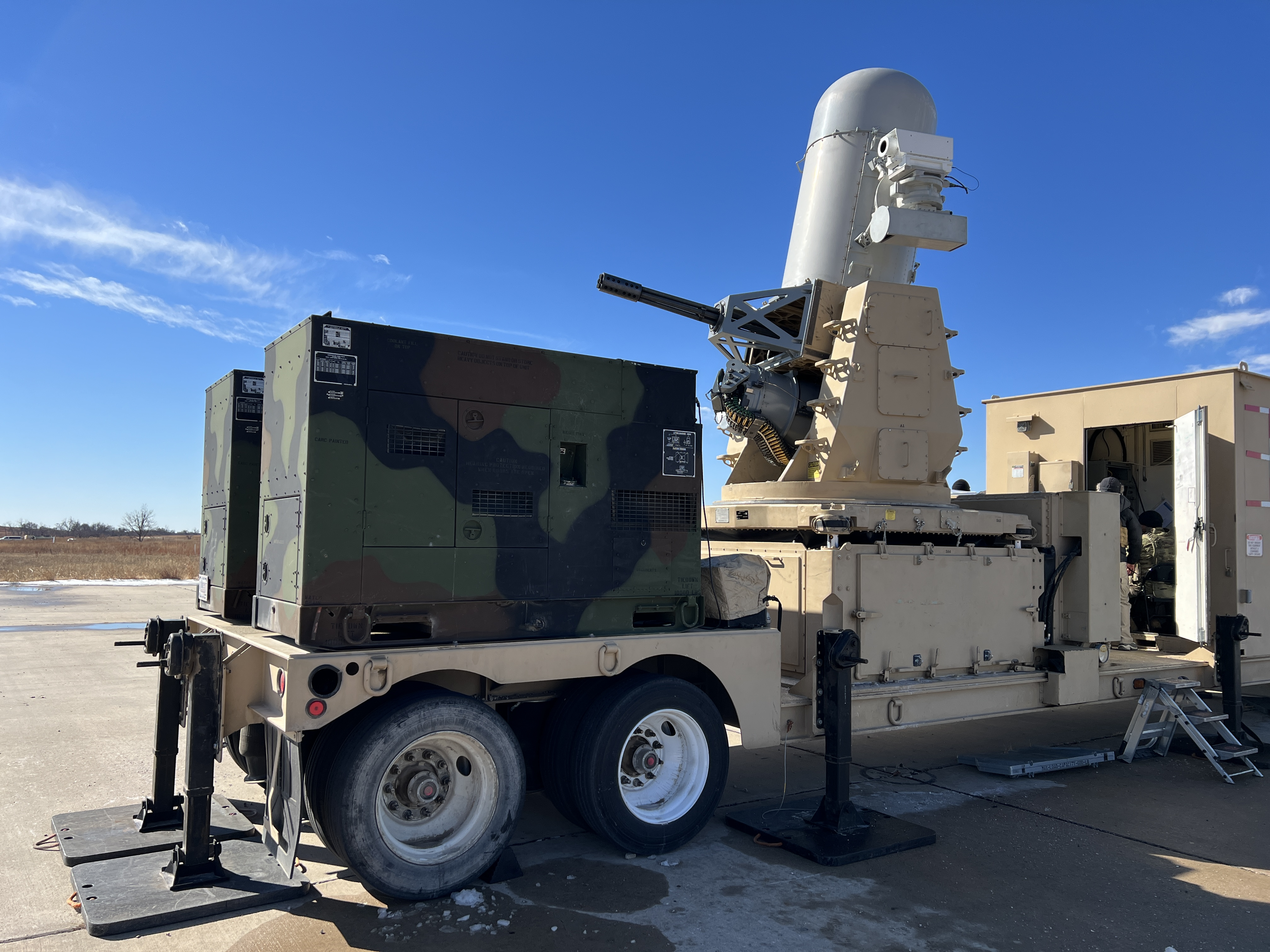 - Virginia National Guard Soldiers assigned to 1st Battalion, 111th Field Artillery Regiment, 116th Infantry Brigade Combat Team conduct pre-aim calibration test firing on the Counter-Rocket, Artillery, Mortar Intercept Land-based Phalanx Weapon System Feb. 6, 2022, at Fort Sill, Oklahoma. C-RAM is a set of systems used to detect and/or destroy incoming rockets, artillery and mortar rounds in the air before they hit their ground targets, and the VNG Soldiers are on federal active duty preparing to deploy to the Central Command area of operations in the Middle East to provide personnel and site protection. The pre-aim calibration test makes sure C-RAM radars are aligned with the guns and see everything the radars see so they can hit their intended target. Soldiers have trained on how load and operate the systems as well as function in the engagement operations center that controls direct fire engagements against suspected targets. (U.S. National Guard photo by Cotton Puryear)