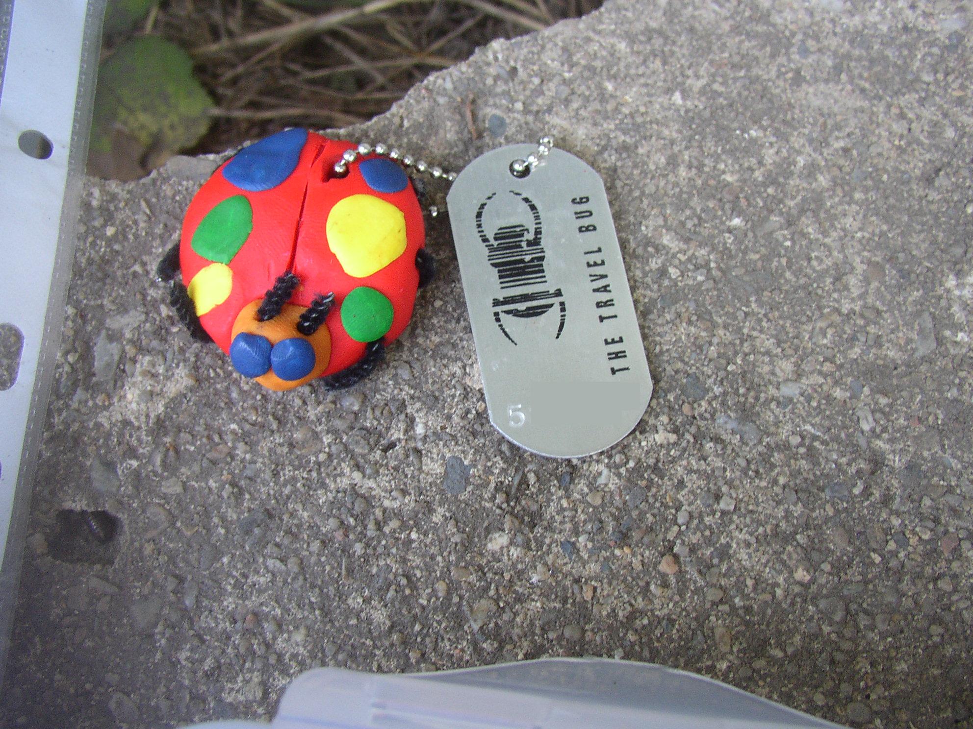 • Čeština: Travel Bug. Kovová visačka staršího zakulaceného vzoru přivěšená na podomácku zhotovené figurce berušky. Země původu: Alberta, Kanada. Spatřeno v Praze. Šesticiferné číslo v dolní části přívěsku, sloužící ke sledování pohybu TB, bylo z fotografie vyjma první číslice odstraněno.