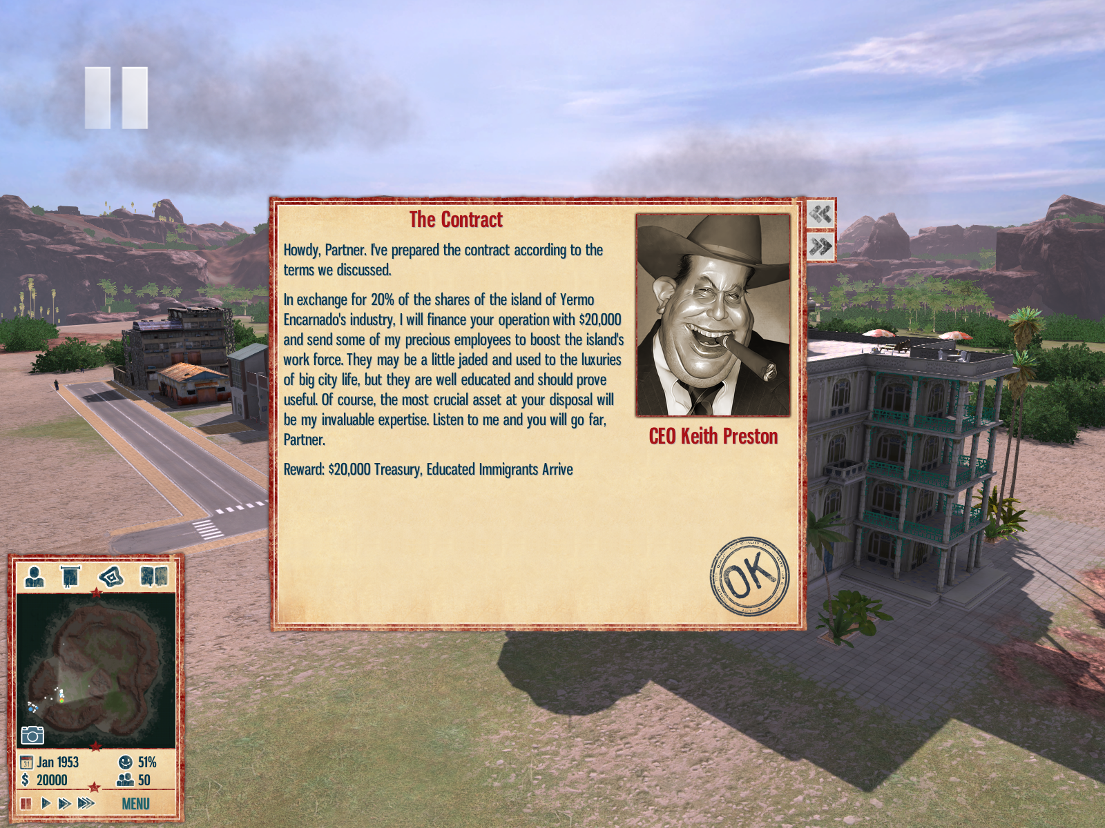 Aktuální snímek počítačové hry + Tropico 4 (GOG.com) + pochází z mého vlastního počítače.