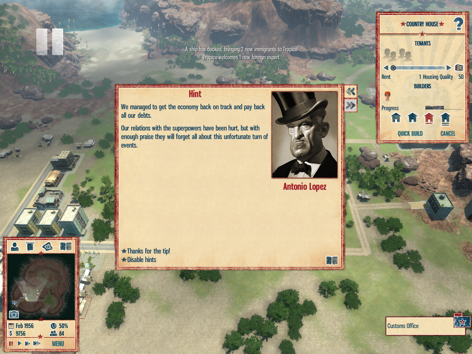 Aktuální snímek počítačové hry + Tropico 4 (GOG.com) + pochází z mého vlastního počítače.