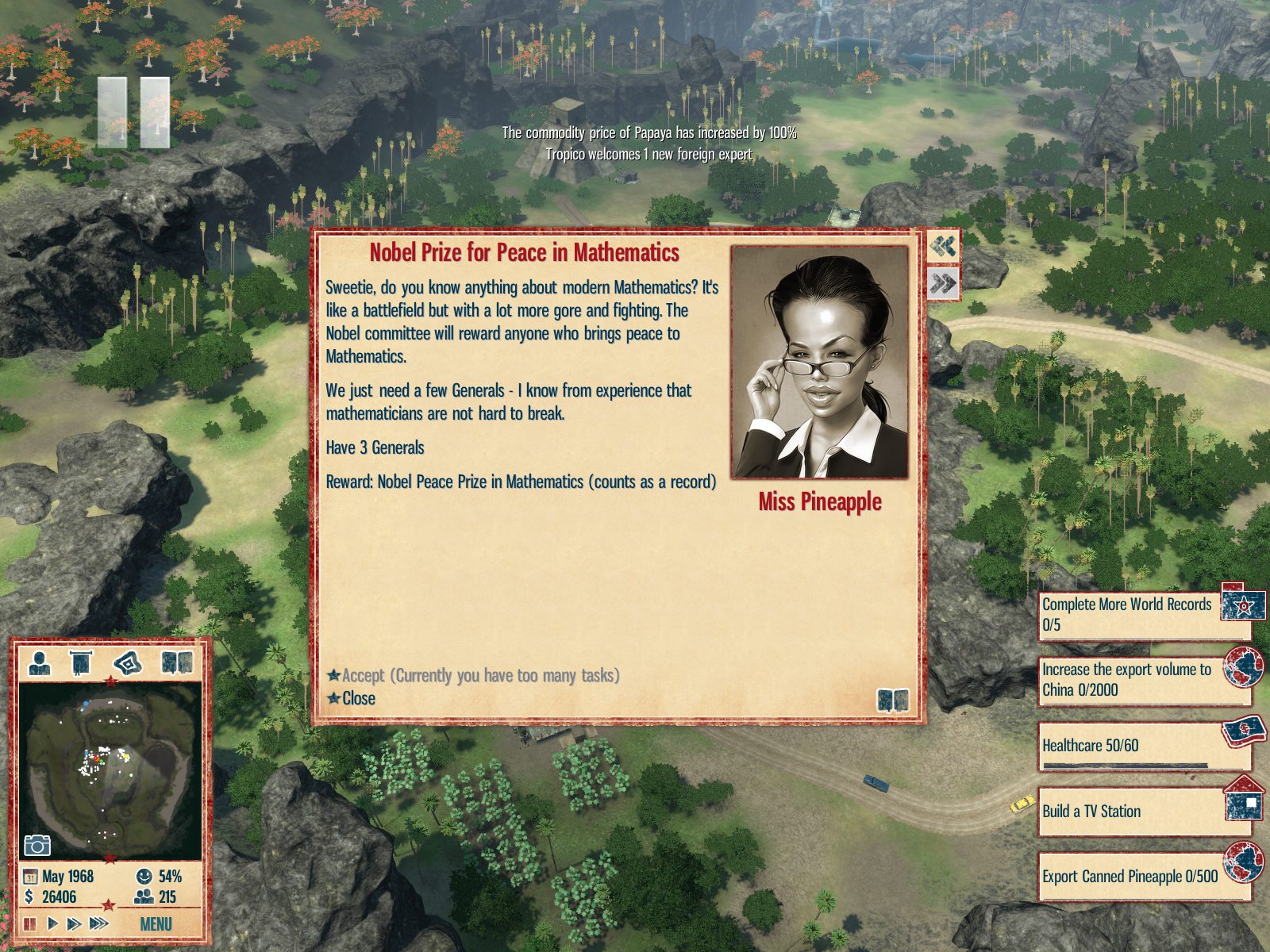 Aktuální snímek počítačové hry + Tropico 4 (GOG.com) + pochází z mého vlastního počítače.