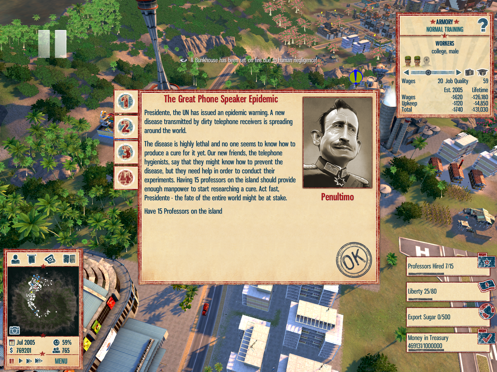 Aktuální snímek počítačové hry + Tropico 4 (GOG.com) + pochází z mého vlastního počítače.