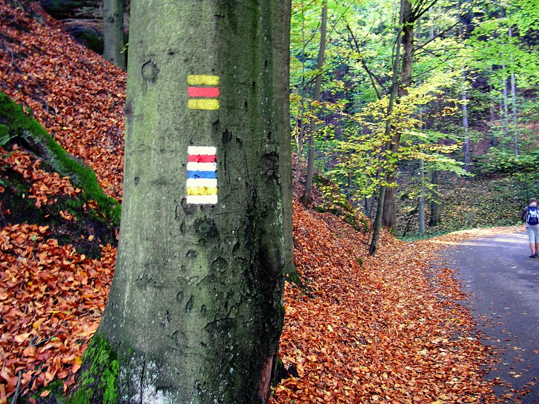 Fotografie + Čeština: Hruboskalsko, okres Semily, Liberecký kraj. Souběh cyklistické turistické trasy a pěších turistických tras.