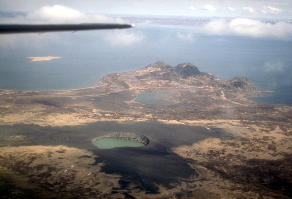 Lake Becharof at top of photo. Water partially fills the eastern maar and completely covers a lava dome that was erupted in the 100-m deep crater during a 10-day eruption in 1977. Maar is about 300 m in diameter.