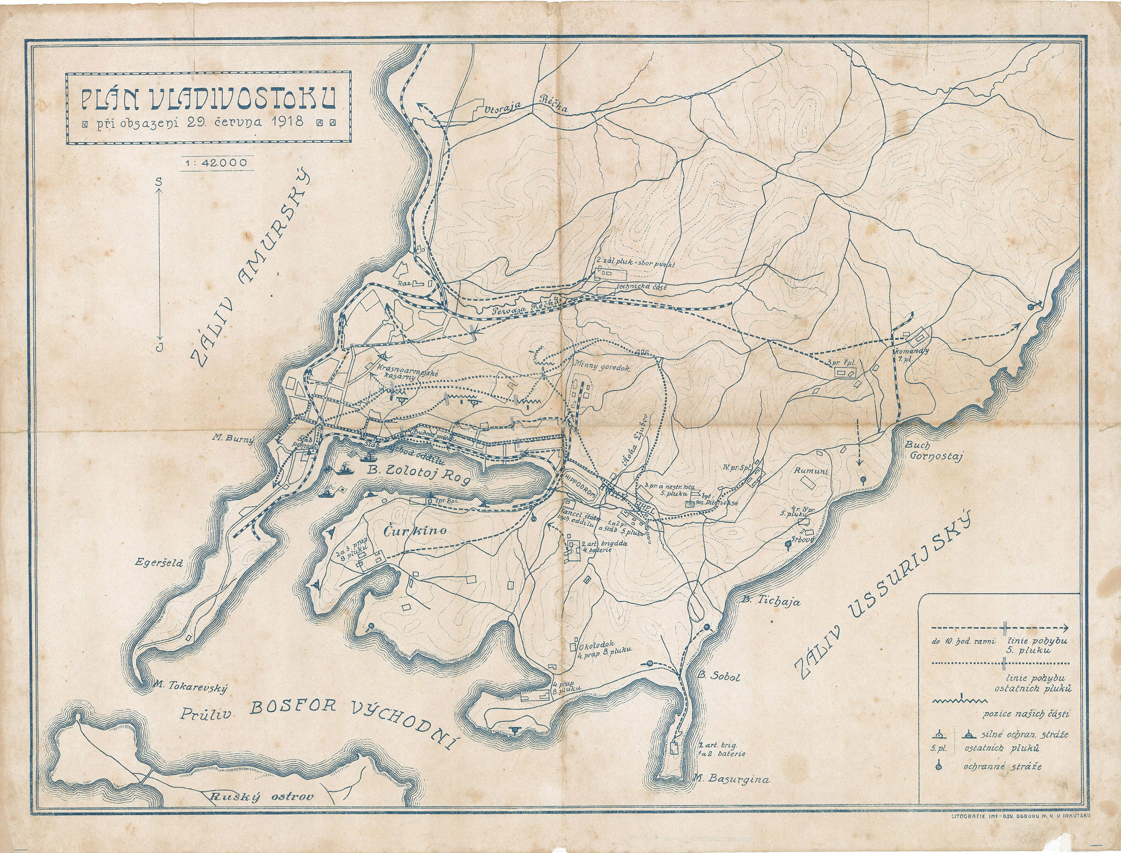 Mapa + Description: Map of Vladivostok when seized by the Czechoslovak Legions on 29 June 1918. The descriptions are in Czech.