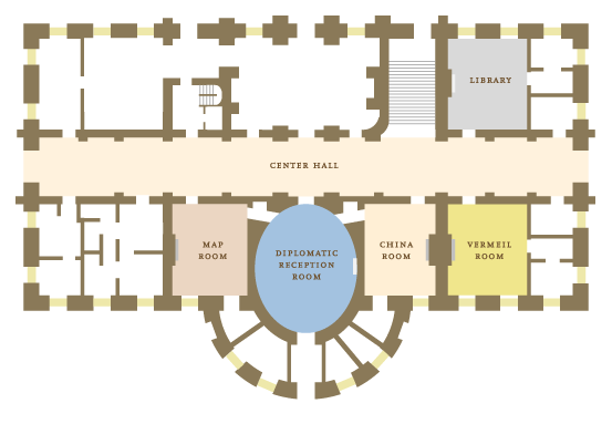 Fotografie + English: Floor plan of the White House ground floor, which features the Diplomatic Reception Room, White House Library, Map Room, Vermeil Room, and China Room