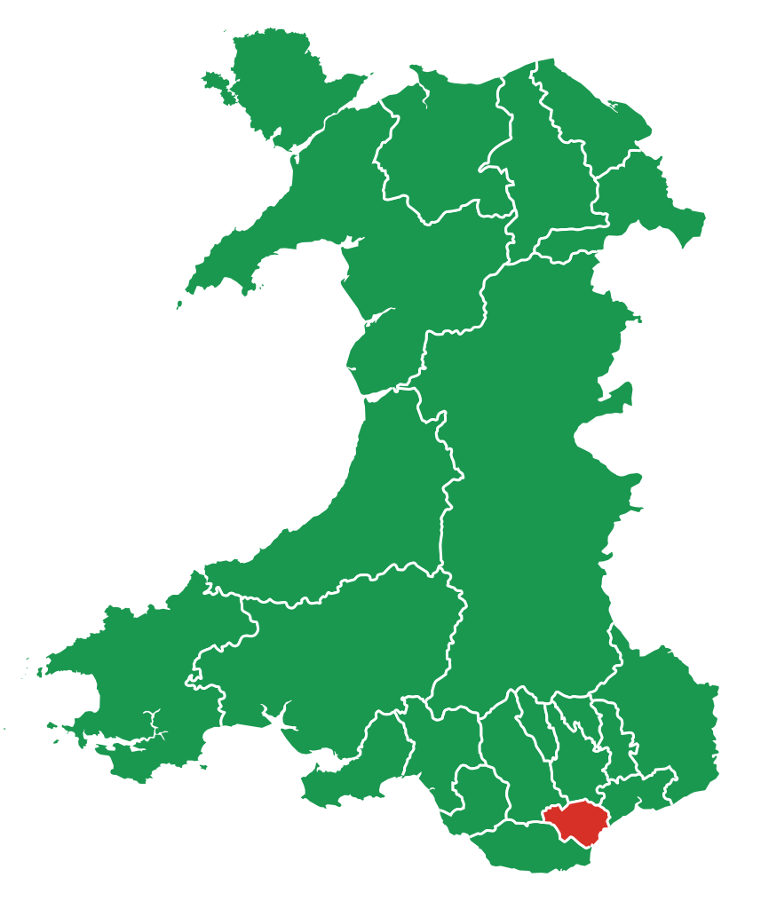 - English: Map showing the principal areas of Wales (green), with Cardiff (red) highlighted.