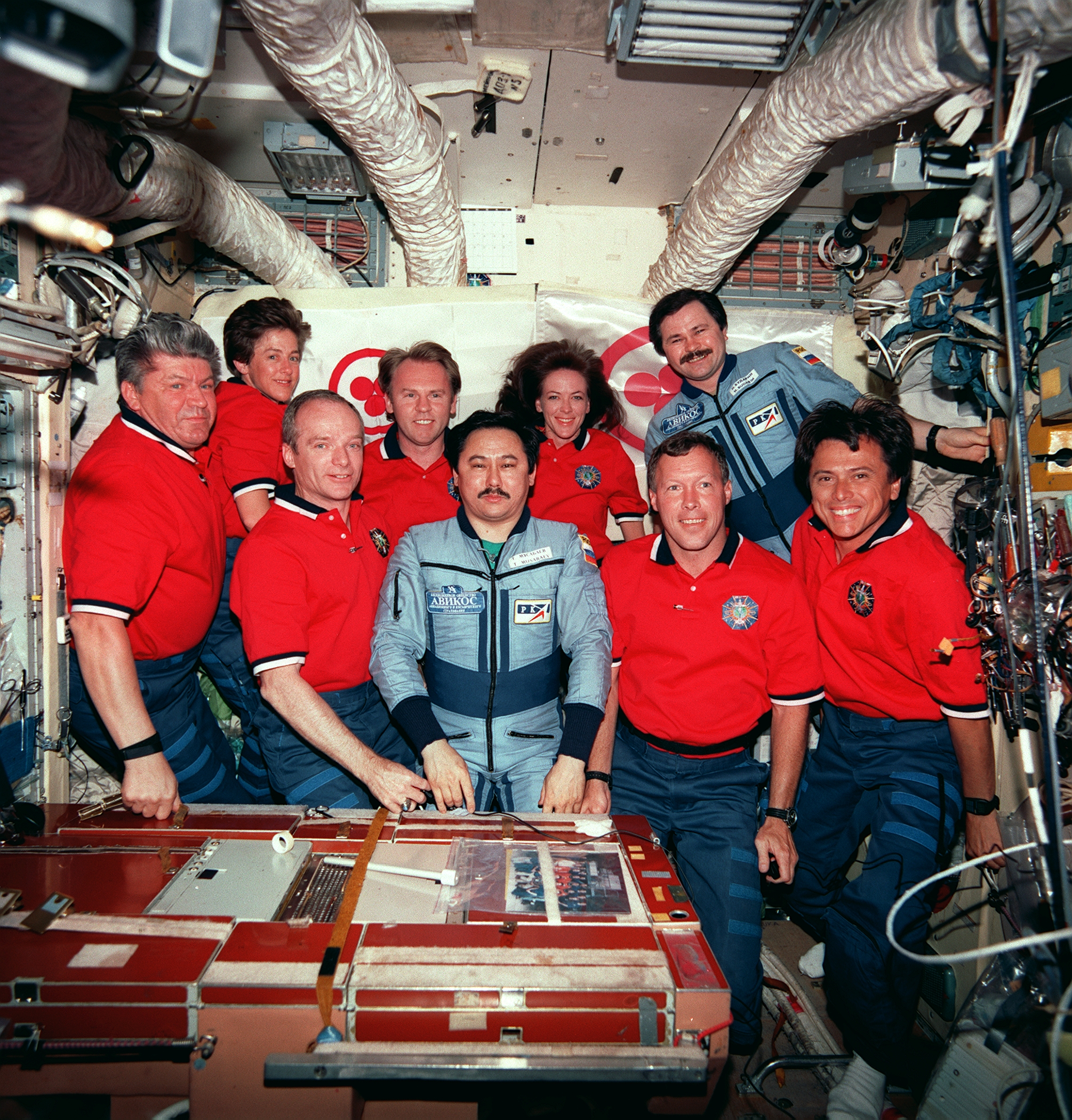 Fotografie + English: The STS-91 crew and Mir EO-25 cosmonauts pose for a photograph in the core module of the Russian space station Mir during the final Shuttle-Mir mission. Left to right are Valery V. Ryumin, Wendy B. Lawrence, Charles J. Precourt, Andrew S.W. Thomas, Talgat Musabayev, Janet L. Kavandi, Dominic C. Gorie, Nikolai Budarin and Franklin R. Chang-Diaz. Ryumin represents the Russian Aviation and Space Agency.
