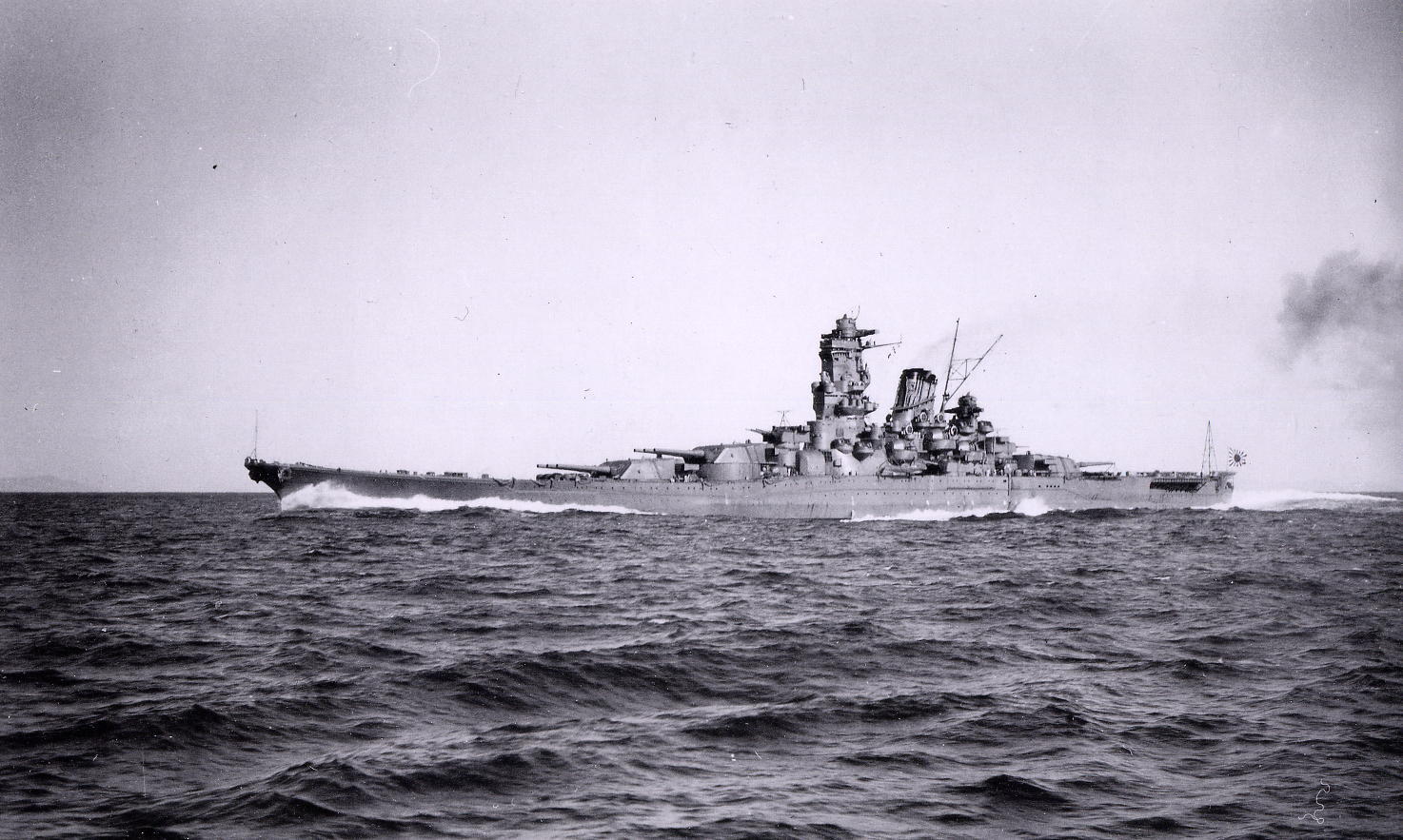 Fotografie + Description: HIJMS Yamato running full-power trials in Sukumo Bay, 1941