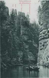Budoucí úsek Edmundovy soutěsky byl provizorně zpřístupněn Franzem Clarem (obchodník se dřevem ze Hřenska) už v roce 1889 systémem dřevěných ukotvených plovoucích lávek a chodníčků,v jednom úseku se dokonce plulo na voru; celé zařízení však bylo příliš křehké a neodolalo by častým větším vodám na říčce. Proto bylo od září 1890 na žádost Horského spolku pro České Švýcarsko přikročeno k důkladnému zpřístupnění soutěsky Edmundem Clary-Aldringenem, majitelem zdejšího panství, až neuvěřitelně časově krátkou výstavbou promenádní stezky s třemi tunely u Edmundovy soutěsky, soustavy můstků, jezu a veřejných turistických plaveb na pramicích. Divoká soutěska byla zpřístupněna a otevřena v roce 1898 už po smrti Edmunda Claryho-Aldringena (zemřel roku 1894) jeho následníky.[1]