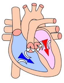 Při diastole síní (za současné systoly komor) přitéká do pravé síně oběma dutými žilami krev z velkého tělního oběhu, zatímco do levé síně přitéká krev z plicních žil. Následuje systola obou síní (současně s diastolou obou komor), při které je krev ze síní vypuzena do komor. Aby nedocházelo ke zpětnému toku krve z komor do síní, je mezi pravou síní a komorou trojcípá chlopeň a mezi levou síní a komorou chlopeň dvojcípá (viz výše). Tyto chlopně se při následné systole komor uzavřou a krev z komor je tak vypuzena do plicního kmene a do aorty. Zpětnému toku krve do komor brání poloměsíčité chlopně uzavírající jak plicní kmen tak aortu.