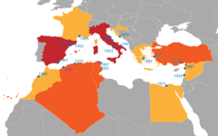 - Evropa: Albánie, Andorra, Bosna a Hercegovina, Černá Hora, Francie, Chorvatsko, Itálie, Kypr, Malta, Monako, Řecko, San Marino, Srbsko, Slovinsko, Španělsko a Turecko